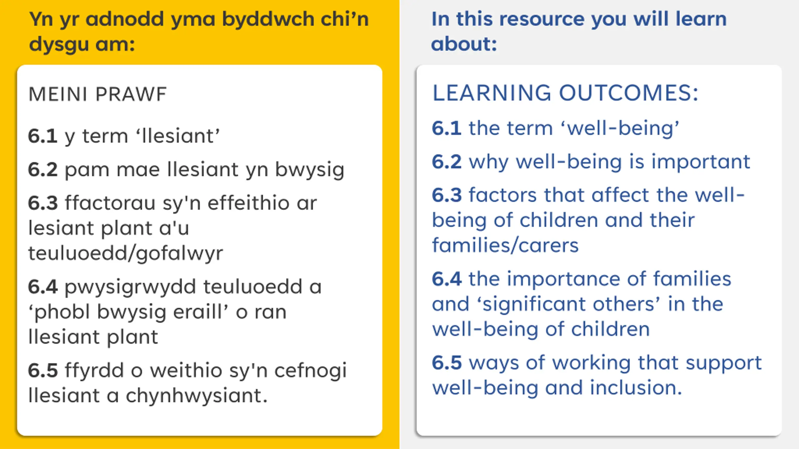 In this resource you will learn about: Yn yr adnodd yma byddwch chi n dysgu am: LEARNING OUTCOMES: 6.1 the term well-being 6.2 why well-being is important 6.3 factors that affect the well- being of children and their families/carers 6.4 the importance of families and significant others in the well-being of children 6.5 ways of working that support well-being and inclusion. MEINI PRAWF 6.1 y term llesiant 6.2 pam mae llesiant yn bwysig 6.3 ffactorau sy'n effeithio ar lesiant plant a'u teuluoedd/gofalwyr 6.4 pwysigrwydd teuluoedd a phobl bwysig eraill o ran llesiant plant 6.5 ffyrdd o weithio sy'n cefnogi llesiant a chynhwysiant.