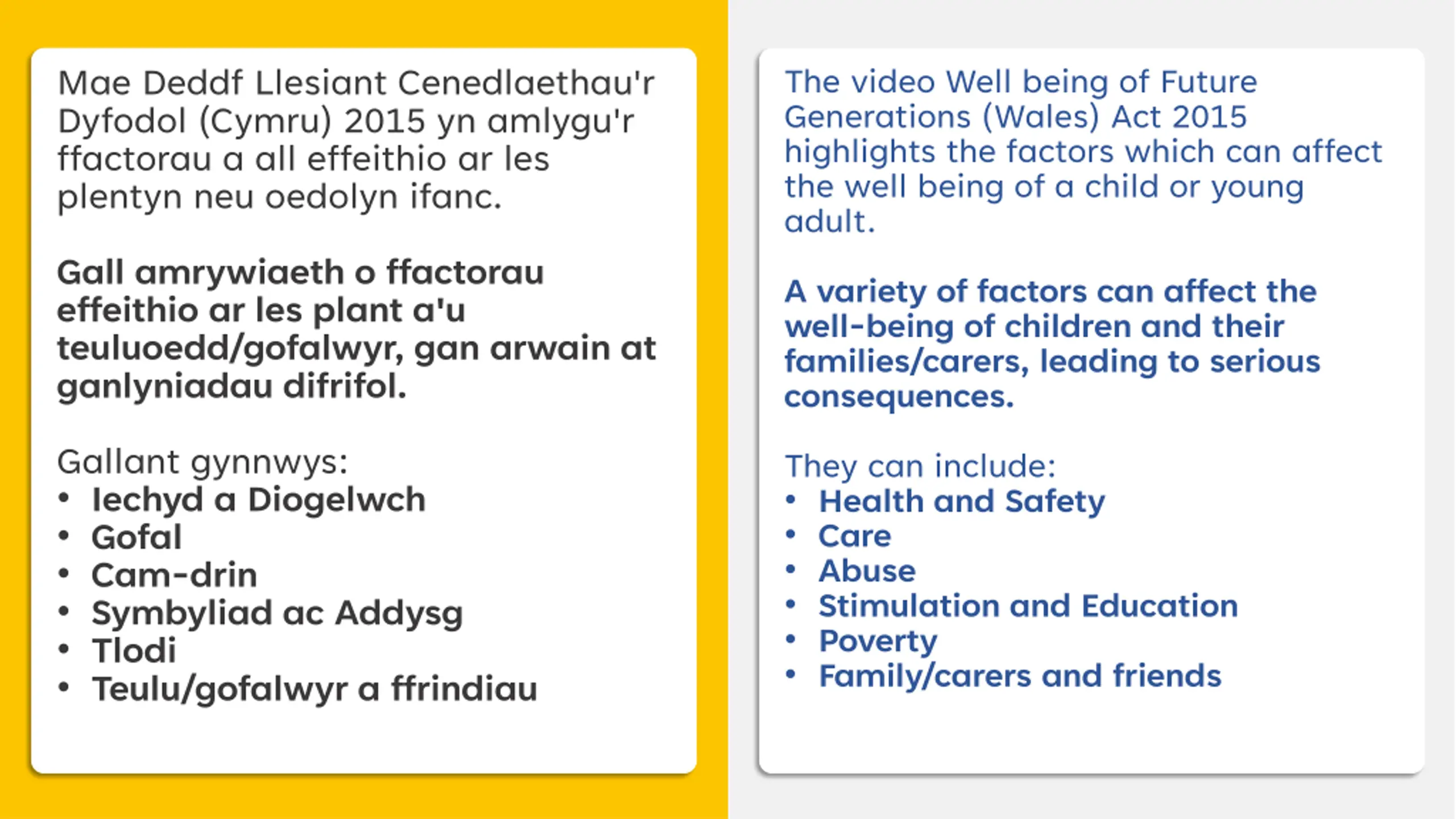 Mae Deddf Llesiant Cenedlaethau'r Dyfodol (Cymru) 2015 yn amlygu'r ffactorau a all effeithio ar les plentyn neu oedolyn ifanc. The video Well being of Future Generations (Wales) Act 2015 highlights the factors which can affect the well being of a child or young adult. Gall amrywiaeth o ffactorau effeithio ar les plant a'u teuluoedd/gofalwyr, gan arwain at ganlyniadau difrifol. A variety of factors can affect the well-being of children and their families/carers, leading to serious consequences. Gallant gynnwys: Iechyd a Diogelwch Gofal Cam-drin Symbyliad ac Addysg Tlodi Teulu/gofalwyr a ffrindiau They can include: Health and Safety Care Abuse Stimulation and Education Poverty Family/carers and friends
