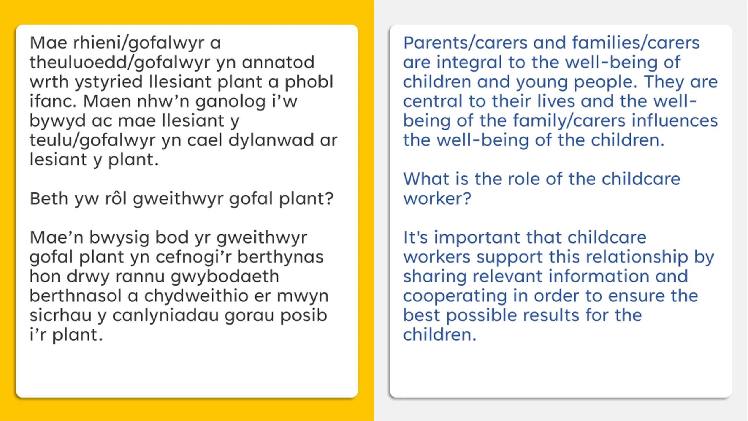 Mae rhieni/gofalwyr a theuluoedd/gofalwyr yn annatod wrth ystyried llesiant plant a phobl ifanc. Maen nhw n ganolog i w bywyd ac mae llesiant y teulu/gofalwyr yn cael dylanwad ar lesiant y plant. Parents/carers and families/carers are integral to the well-being of children and young people. They are central to their lives and the well- being of the family/carers influences the well-being of the children. What is the role of the childcare worker? Beth yw r l gweithwyr gofal plant? Mae n bwysig bod yr gweithwyr gofal plant yn cefnogi r berthynas hon drwy rannu gwybodaeth berthnasol a chydweithio er mwyn sicrhau y canlyniadau gorau posib i r plant. It's important that childcare workers support this relationship by sharing relevant information and cooperating in order to ensure the best possible results for the children.