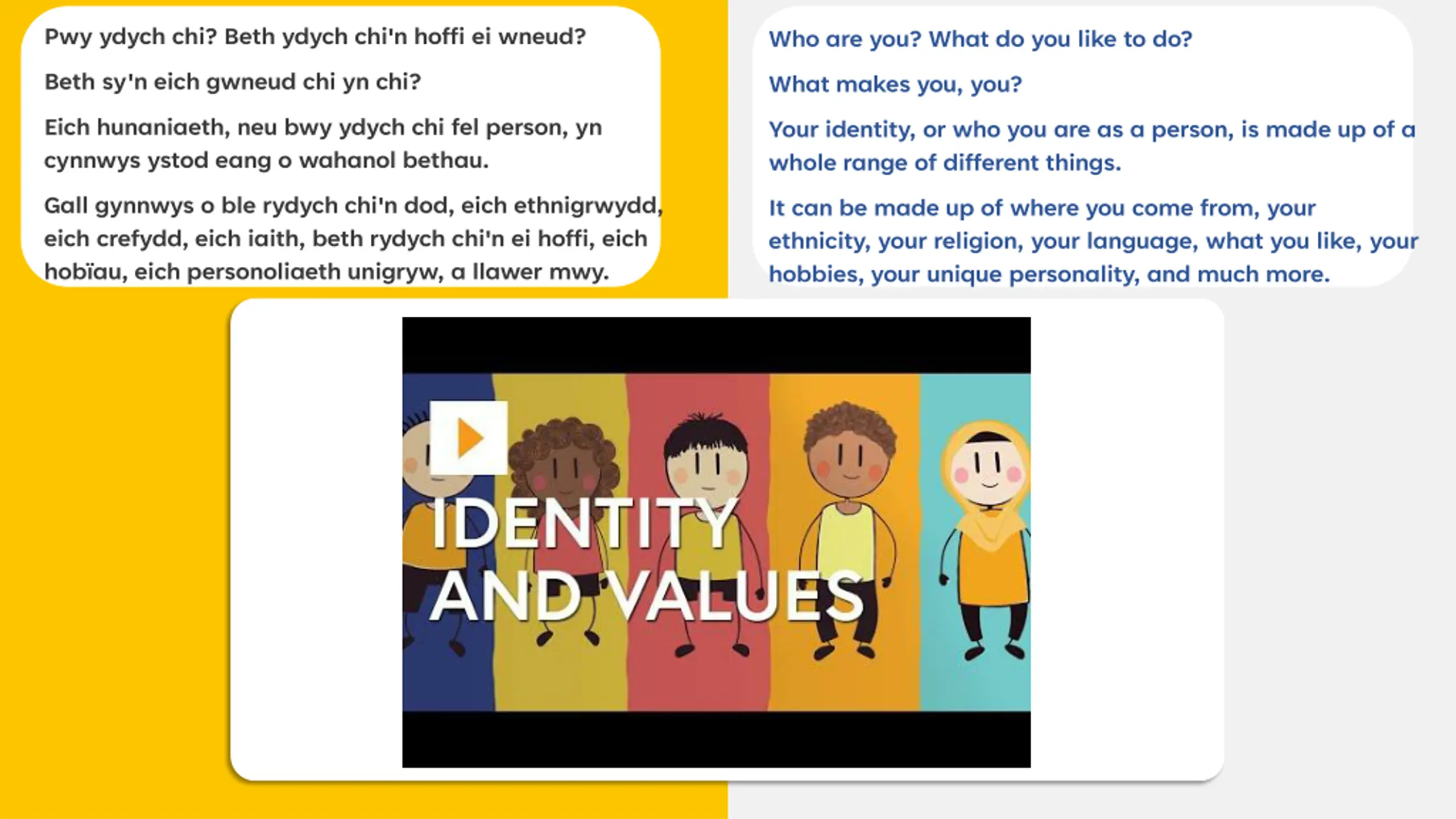 Pwy ydych chi? Beth ydych chi'n hoffi ei wneud? Who are you? What do you like to do? Beth sy'n eich gwneud chi yn chi? What makes you, you? Eich hunaniaeth, neu bwy ydych chi fel person, yn cynnwys ystod eang o wahanol bethau. Your identity, or who you are as a person, is made up of a whole range of different things. Gall gynnwys o ble rydych chi'n dod, eich ethnigrwydd, eich crefydd, eich iaith, beth rydych chi'n ei hoffi, eich hob au, eich personoliaeth unigryw, a llawer mwy. It can be made up of where you come from, your ethnicity, your religion, your language, what you like, your hobbies, your unique personality, and much more. v