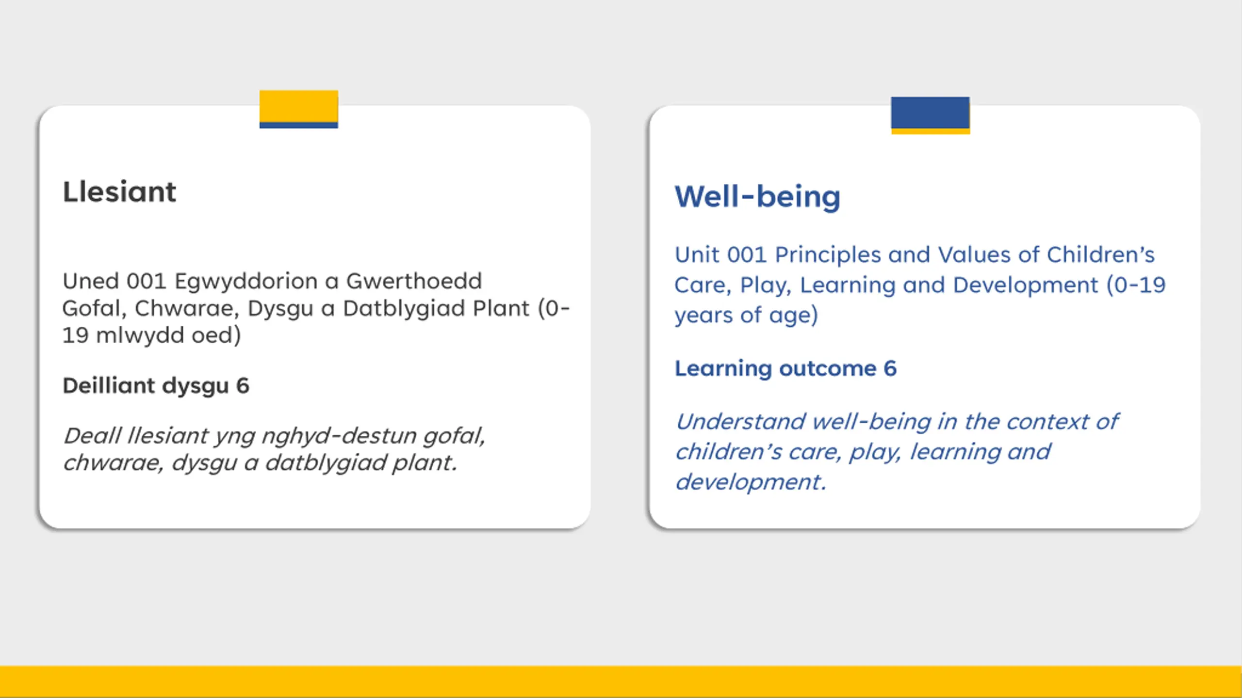 c Llesiant Well-being Unit 001 Principles and Values of Children s Care, Play, Learning and Development (0-19 years of age) Uned 001 Egwyddorion a Gwerthoedd Gofal, Chwarae, Dysgu a Datblygiad Plant (0- 19 mlwydd oed) v v Learning outcome 6 Deilliant dysgu 6 Understand well-being in the context of children s care, play, learning and development. Deall llesiant yng nghyd-destun gofal, chwarae, dysgu a datblygiad plant.