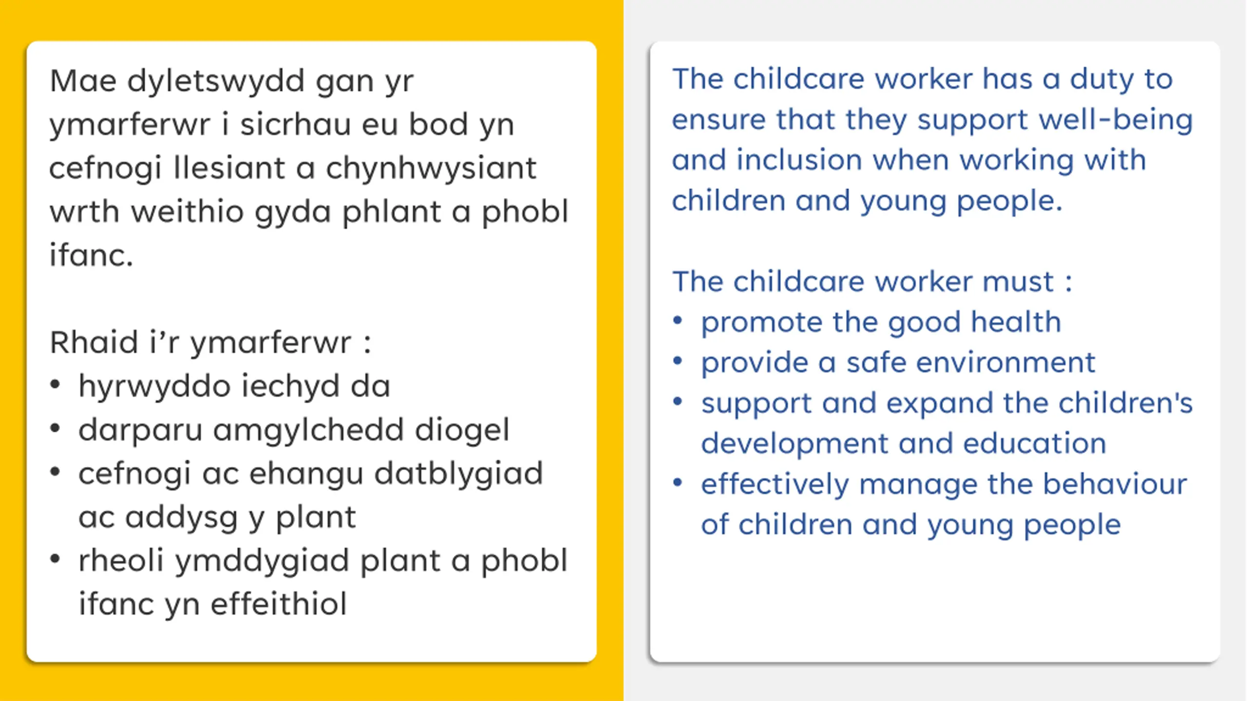 The childcare worker has a duty to ensure that they support well-being and inclusion when working with children and young people. Mae dyletswydd gan yr ymarferwr i sicrhau eu bod yn cefnogi llesiant a chynhwysiant wrth weithio gyda phlant a phobl ifanc. The childcare worker must : promote the good health provide a safe environment support and expand the children's development and education effectively manage the behaviour of children and young people Rhaid i r ymarferwr : hyrwyddo iechyd da darparu amgylchedd diogel cefnogi ac ehangu datblygiad ac addysg y plant rheoli ymddygiad plant a phobl ifanc yn effeithiol