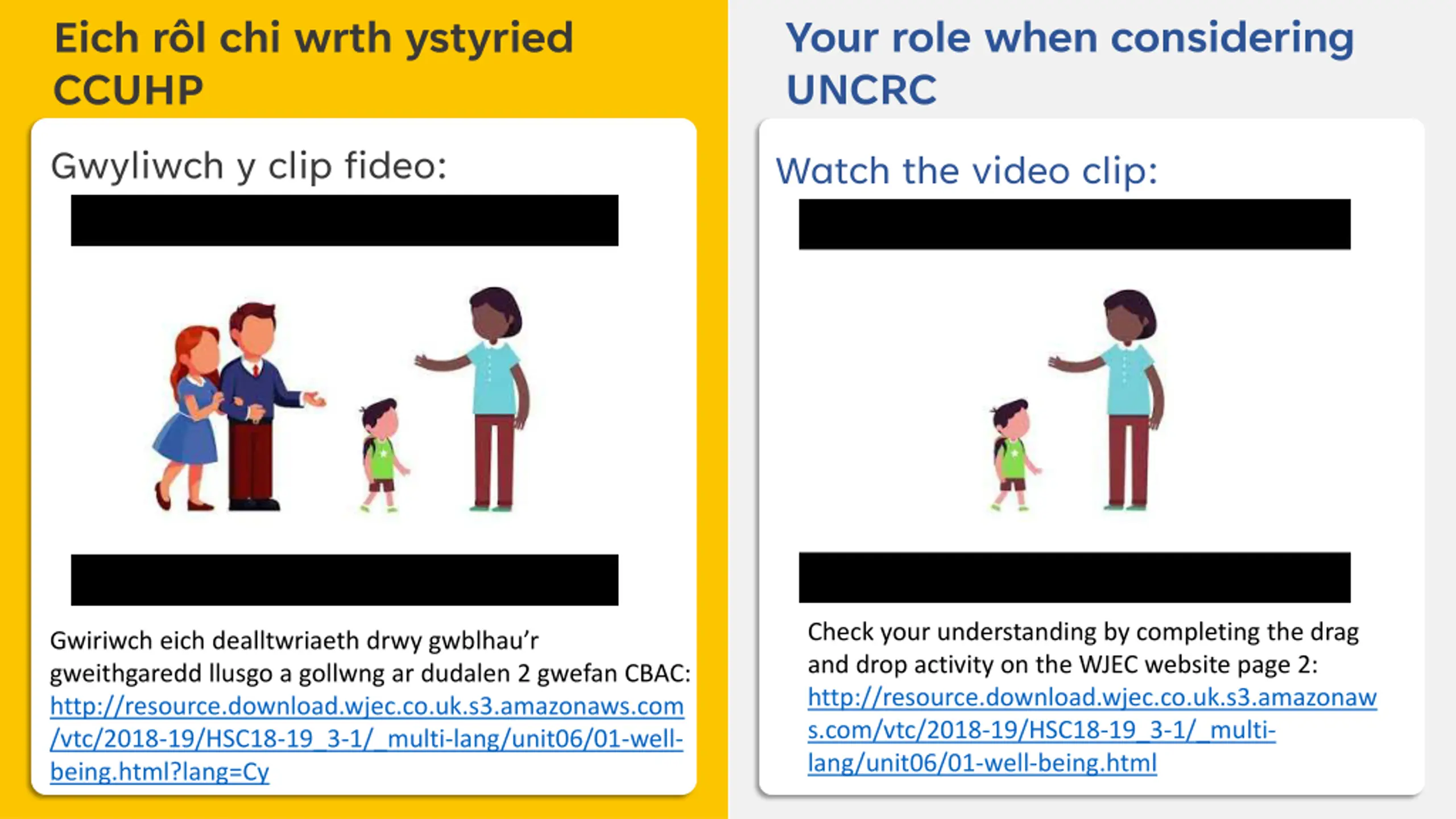 Your role when considering UNCRC Eich r l chi wrth ystyried CCUHP Gwyliwch y clip fideo: Watch the video clip: Check your understanding by completing the drag and drop activity on the WJEC website page 2: http://resource.download.wjec.co.uk.s3.amazonaw s.com/vtc/2018-19/HSC18-19_3-1/_multi- lang/unit06/01-well-being.html Gwiriwch eich dealltwriaeth drwy gwblhau r gweithgaredd llusgo a gollwng ar dudalen 2 gwefan CBAC: http://resource.download.wjec.co.uk.s3.amazonaws.com /vtc/2018-19/HSC18-19_3-1/_multi-lang/unit06/01-well- being.html?lang=Cy