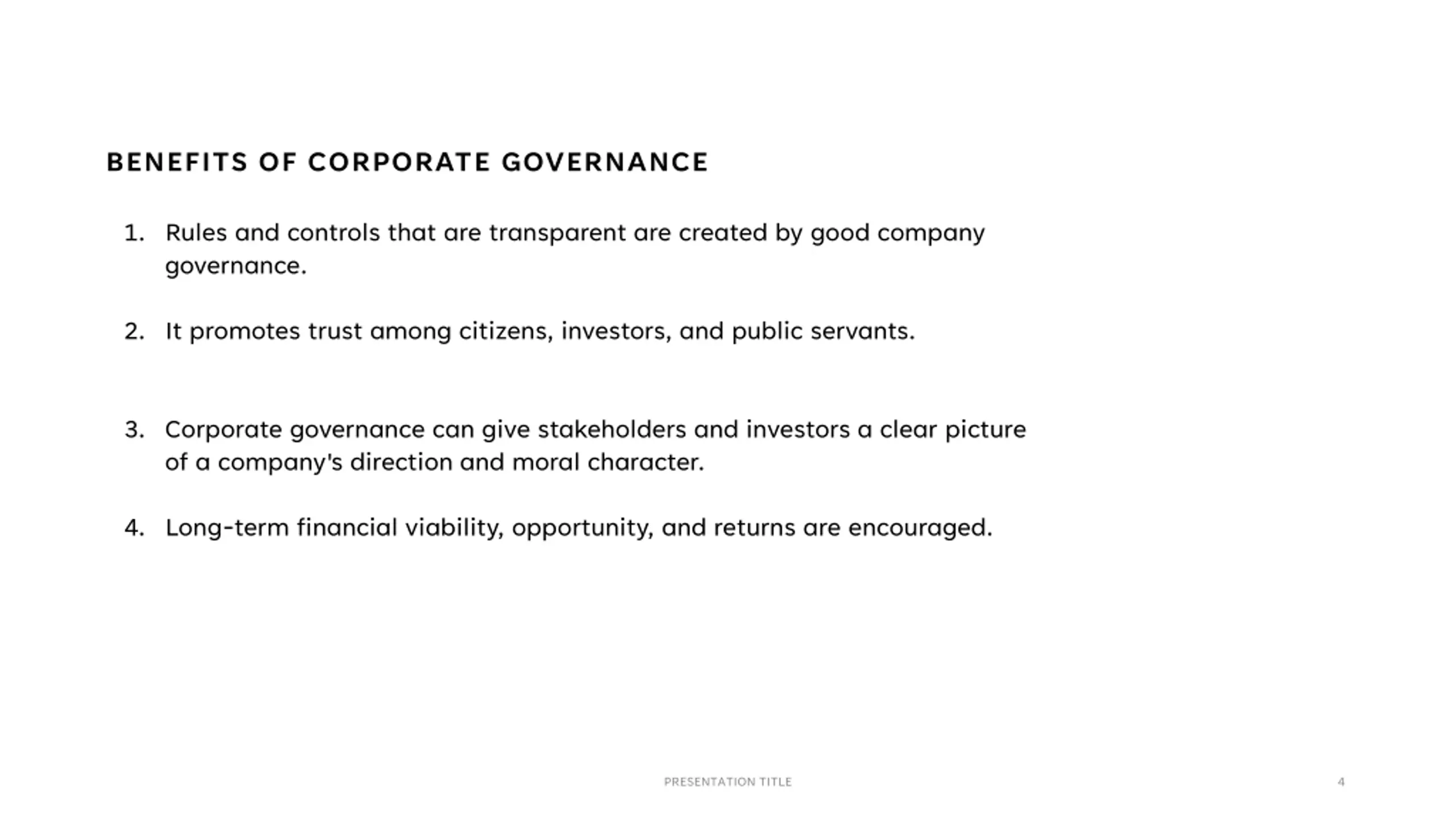 BENEFITS OF CORPORATE GOVERNANCE 1. Rules and controls that are transparent are created by good company governance. 2. It promotes trust among citizens, investors, and public servants. 3. Corporate governance can give stakeholders and investors a clear picture of a company's direction and moral character. 4. Long-term financial viability, opportunity, and returns are encouraged. PRESENTATION TITLE 4