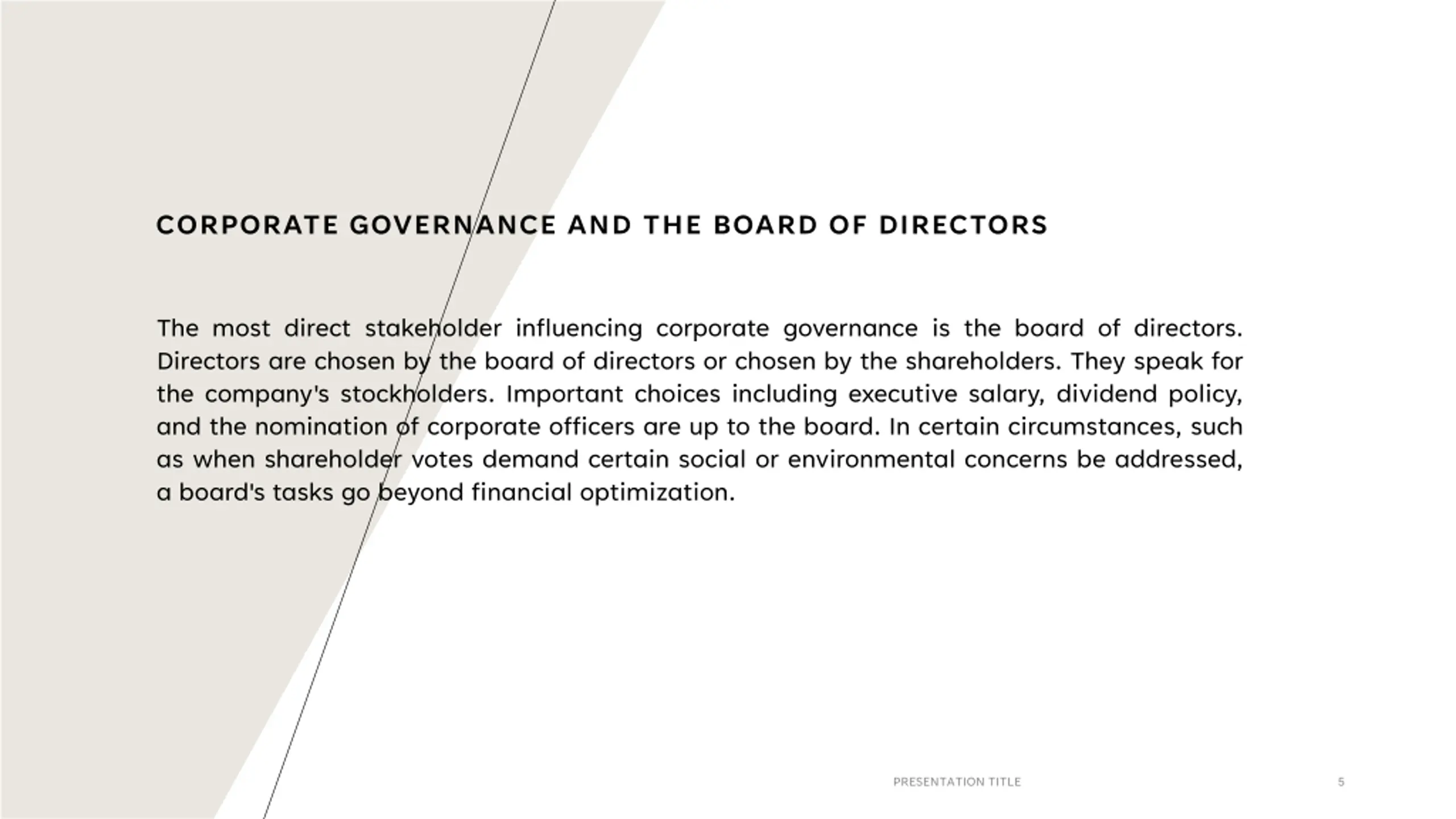 CORPORATE GOVERNANCE AND THE BOARD OF DIRECTORS The most direct stakeholder influencing corporate governance is the board of directors. Directors are chosen by the board of directors or chosen by the shareholders. They speak for the company's stockholders. Important choices including executive salary, dividend policy, and the nomination of corporate officers are up to the board. In certain circumstances, such as when shareholder votes demand certain social or environmental concerns be addressed, a board's tasks go beyond financial optimization. PRESENTATION TITLE 5