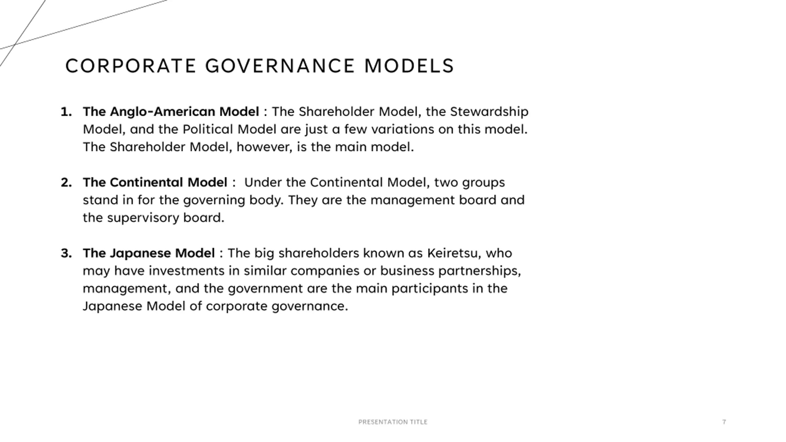 CORPORATE GOVERNANCE MODELS 1. The Anglo-American Model : The Shareholder Model, the Stewardship Model, and the Political Model are just a few variations on this model. The Shareholder Model, however, is the main model. 2. The Continental Model : Under the Continental Model, two groups stand in for the governing body. They are the management board and the supervisory board. 3. The Japanese Model : The big shareholders known as Keiretsu, who may have investments in similar companies or business partnerships, management, and the government are the main participants in the Japanese Model of corporate governance. PRESENTATION TITLE 7