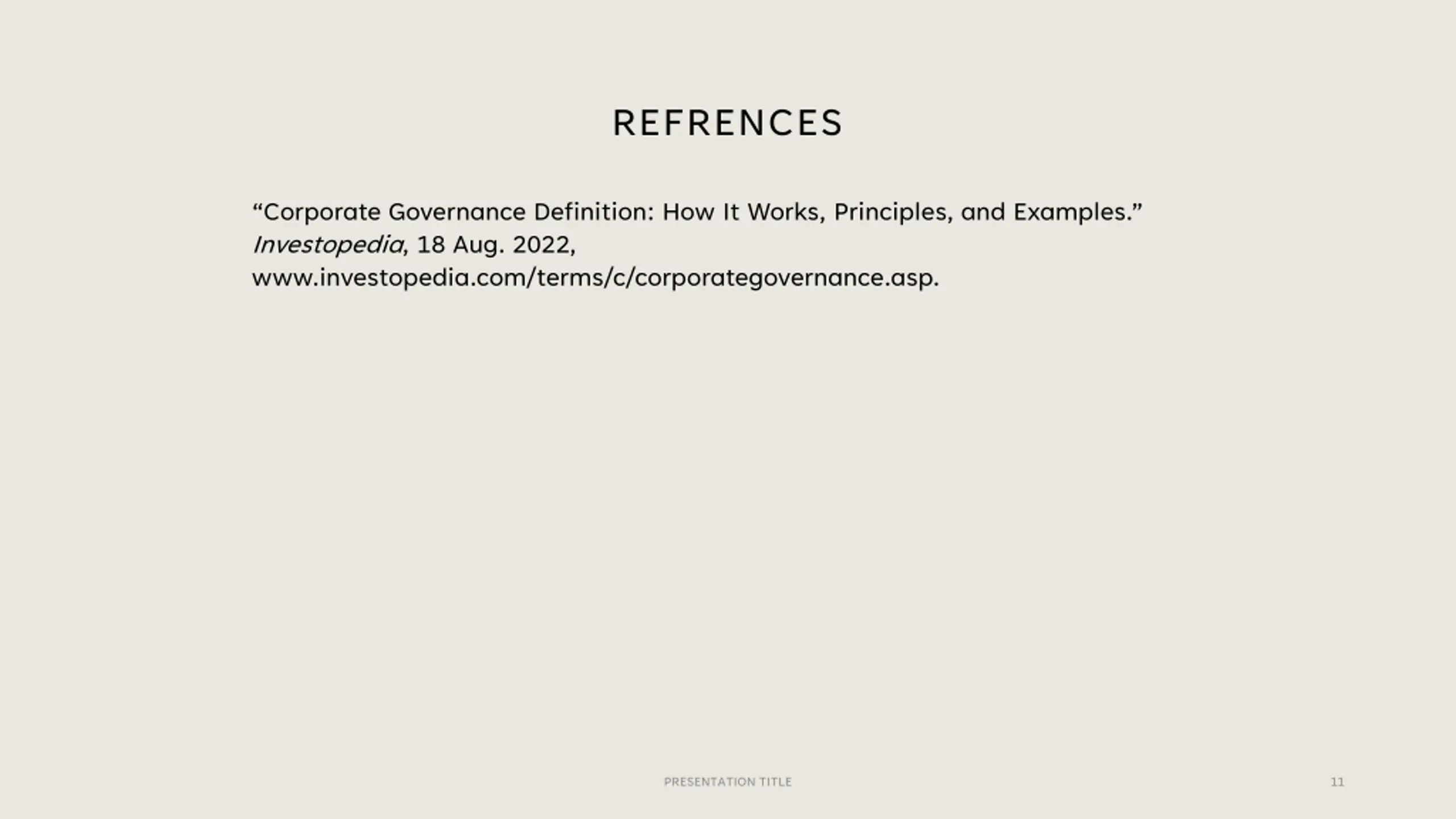 REFRENCES Corporate Governance Definition: How It Works, Principles, and Examples. Investopedia, 18 Aug. 2022, www.investopedia.com/terms/c/corporategovernance.asp. PRESENTATION TITLE 11
