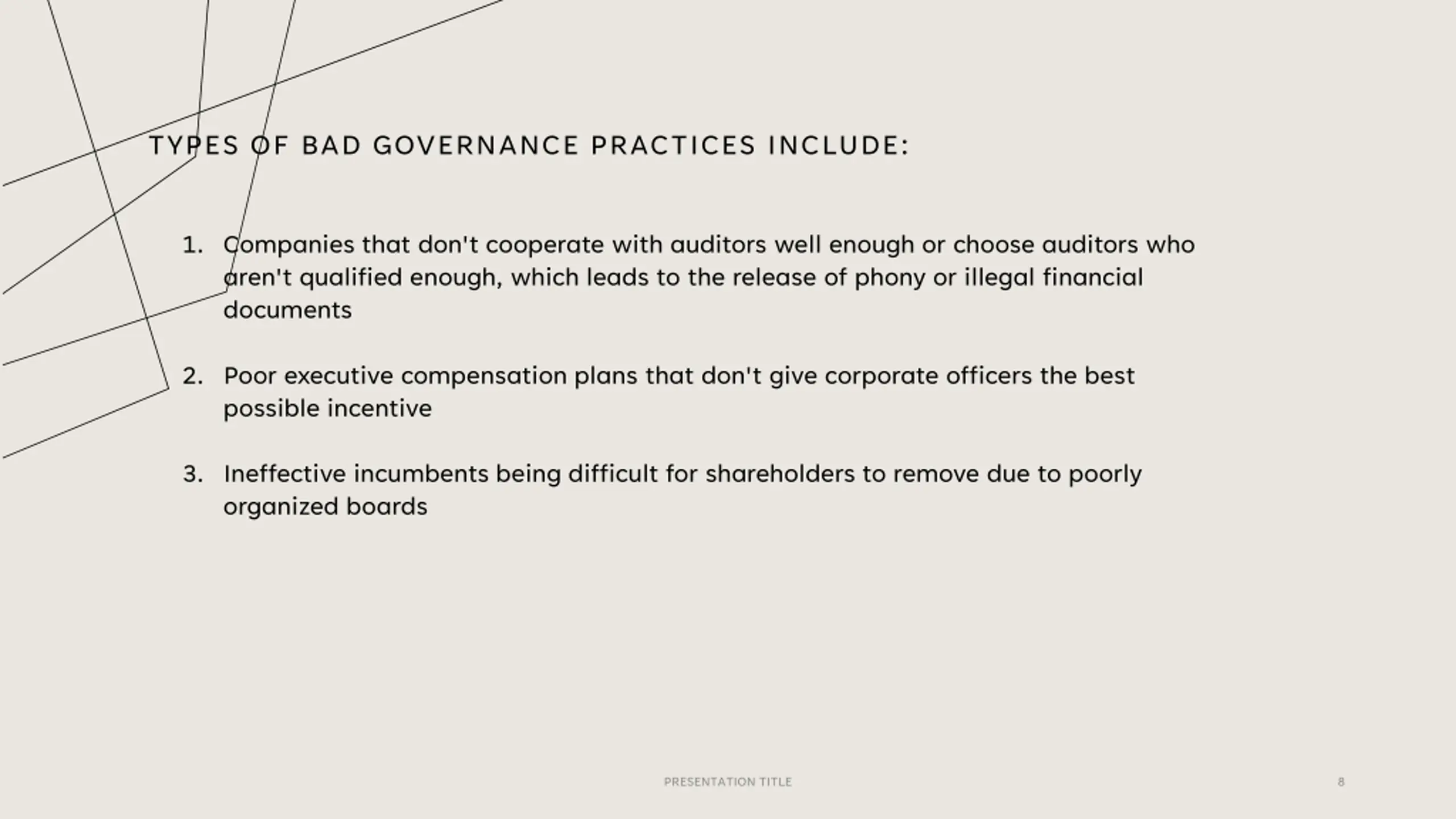 TYPES OF BAD GOVERNANCE PRACTICES INCLUDE: 1. Companies that don't cooperate with auditors well enough or choose auditors who aren't qualified enough, which leads to the release of phony or illegal financial documents 2. Poor executive compensation plans that don't give corporate officers the best possible incentive 3. Ineffective incumbents being difficult for shareholders to remove due to poorly organized boards PRESENTATION TITLE 8