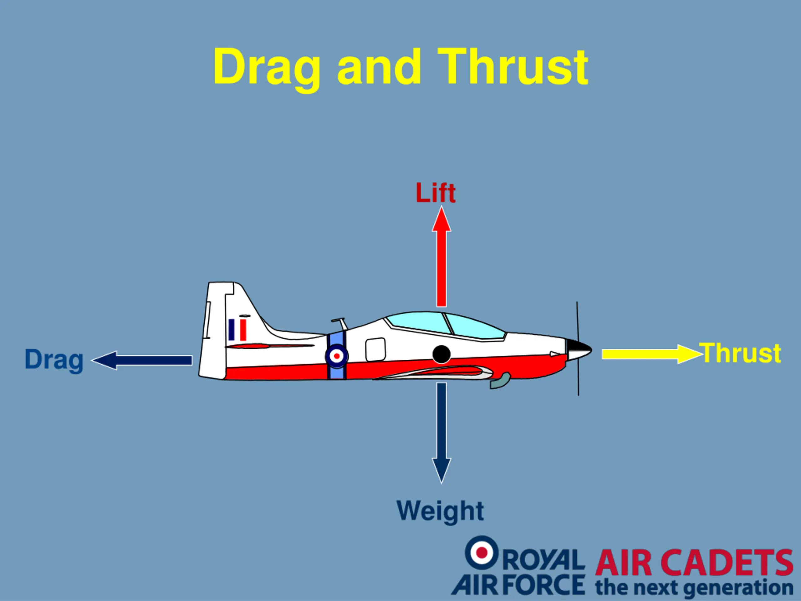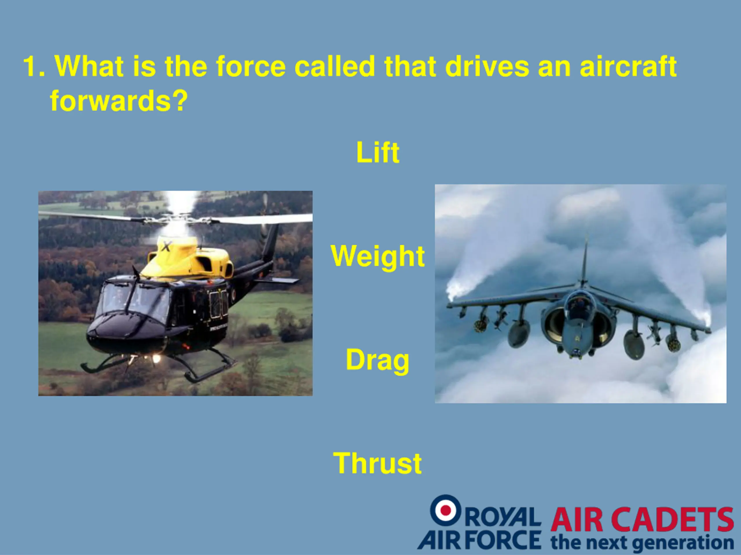 1. What is the force called that drives an aircraft forwards? Lift Weight Drag Thrust