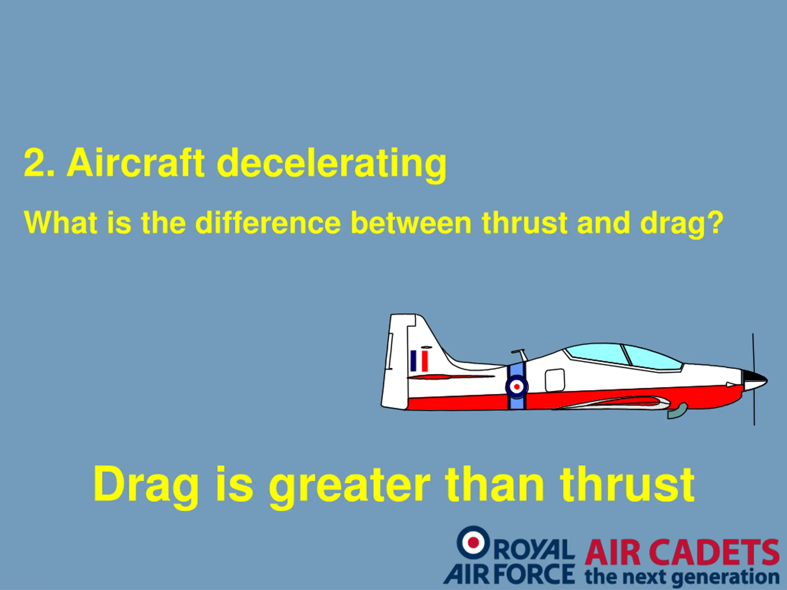 2. Aircraft decelerating What is the difference between thrust and drag? Drag is greater than thrust