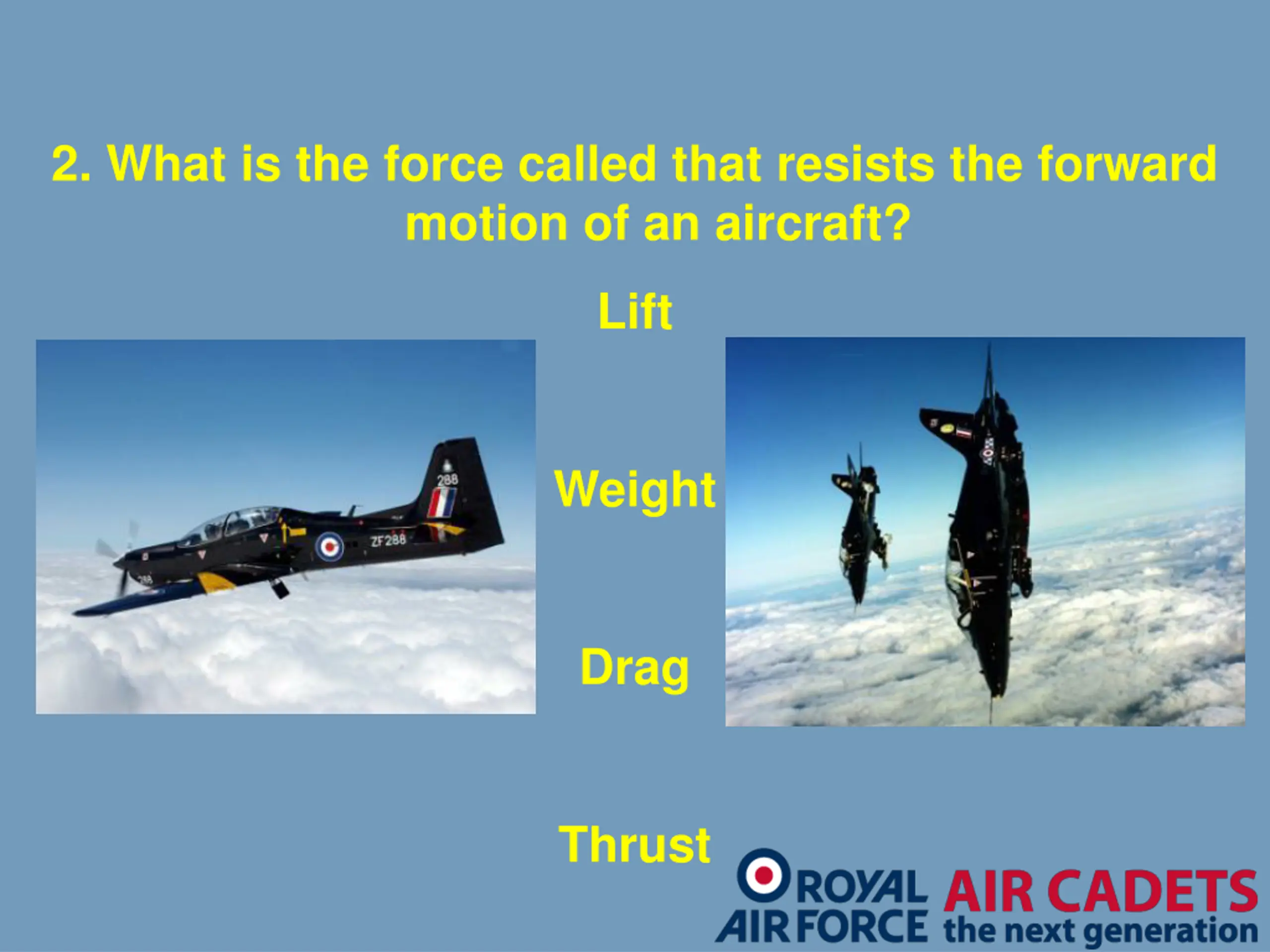 2. What is the force called that resists the forward motion of an aircraft? Lift Weight Drag Thrust