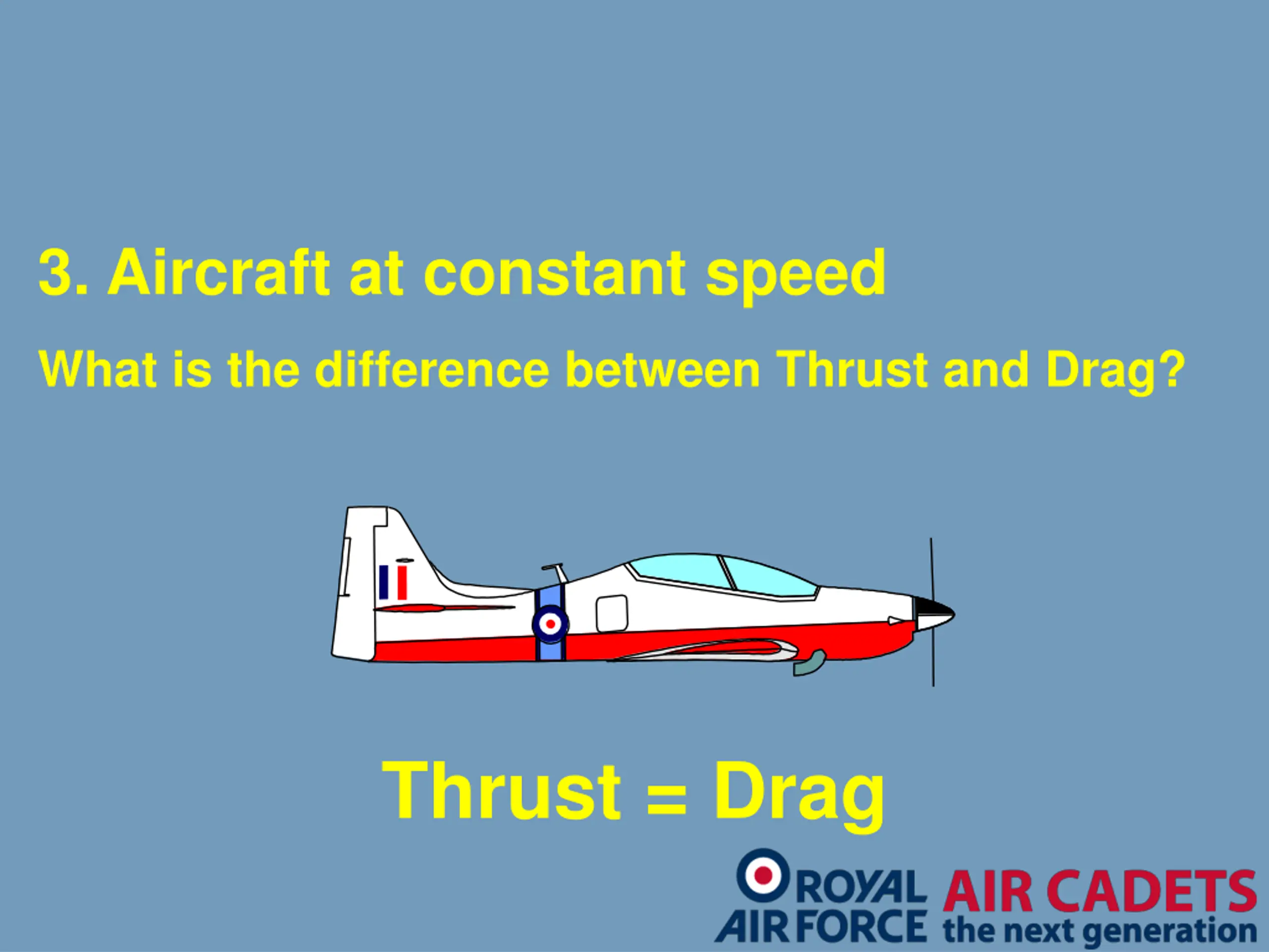 3. Aircraft at constant speed What is the difference between Thrust and Drag? Thrust = Drag