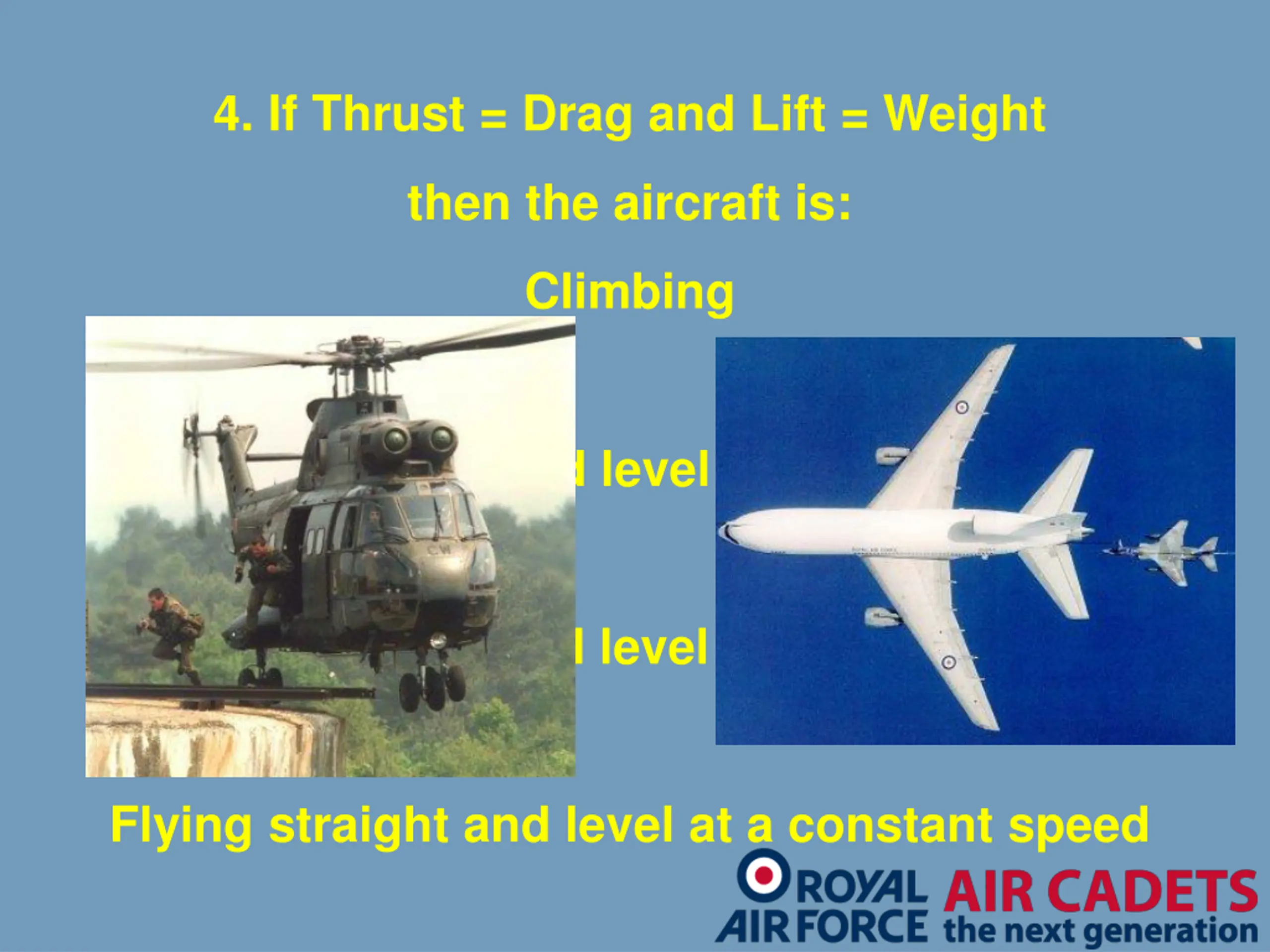 4. If Thrust = Drag and Lift = Weight then the aircraft is: Climbing Flying straight and level and accelerating Flying straight and level and decelerating Flying straight and level at a constant speed
