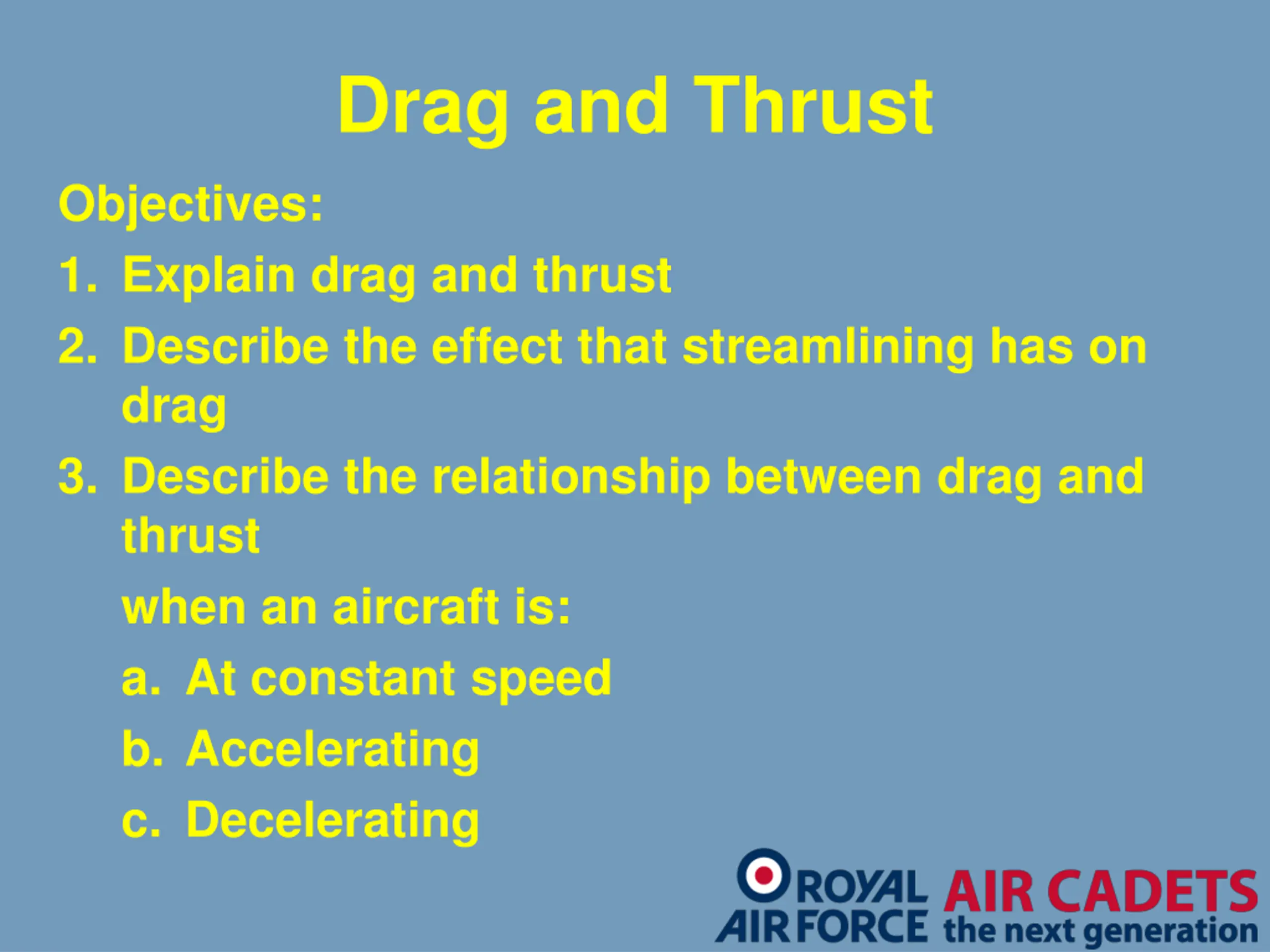 Drag and Thrust Objectives: 1. Explain drag and thrust 2. Describe the effect that streamlining has on drag 3. Describe the relationship between drag and thrust when an aircraft is: a. At constant speed b. Accelerating c. Decelerating