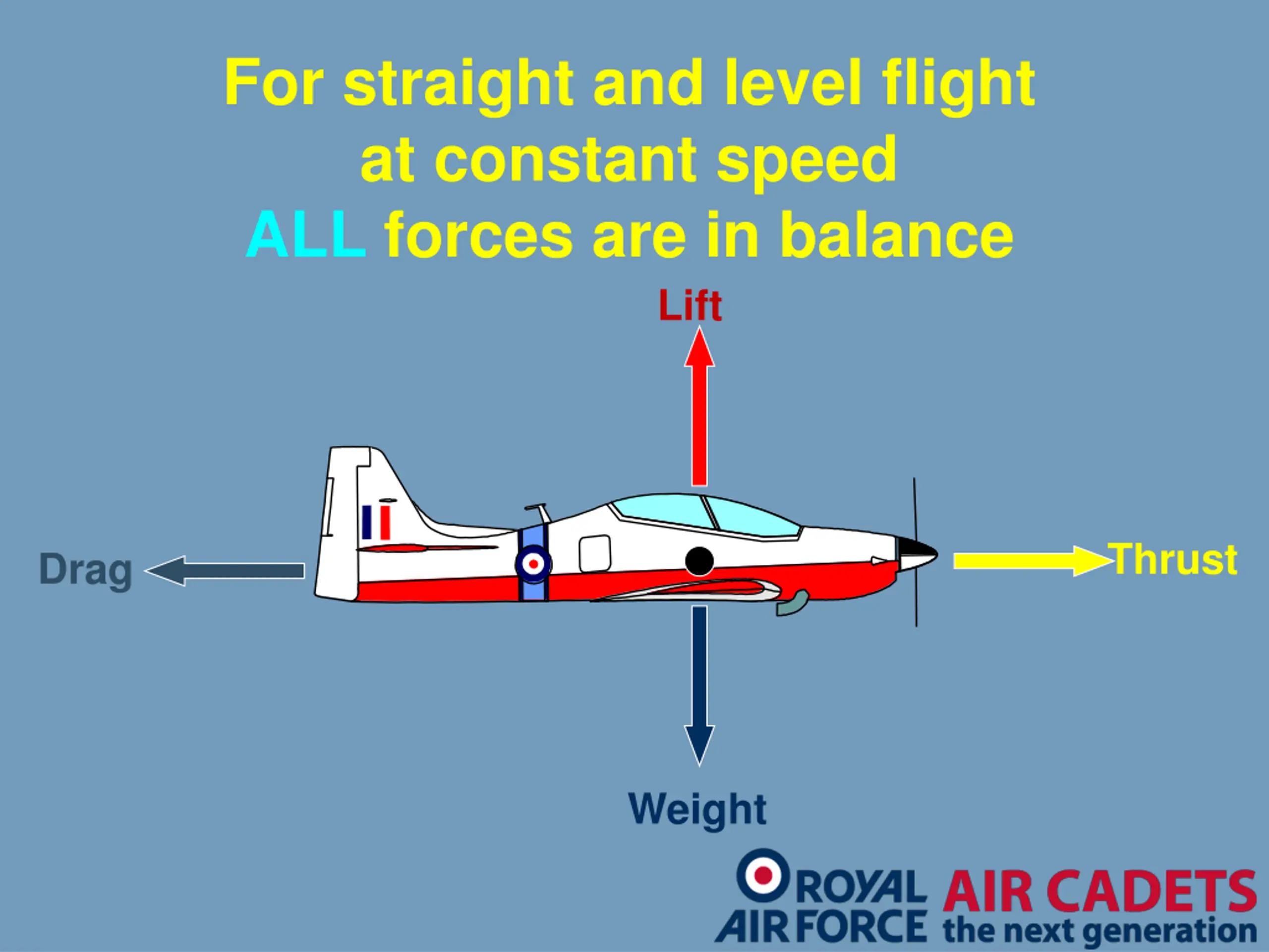For straight and level flight at constant speed ALL forces are in balance Lift Thrust Drag Weight
