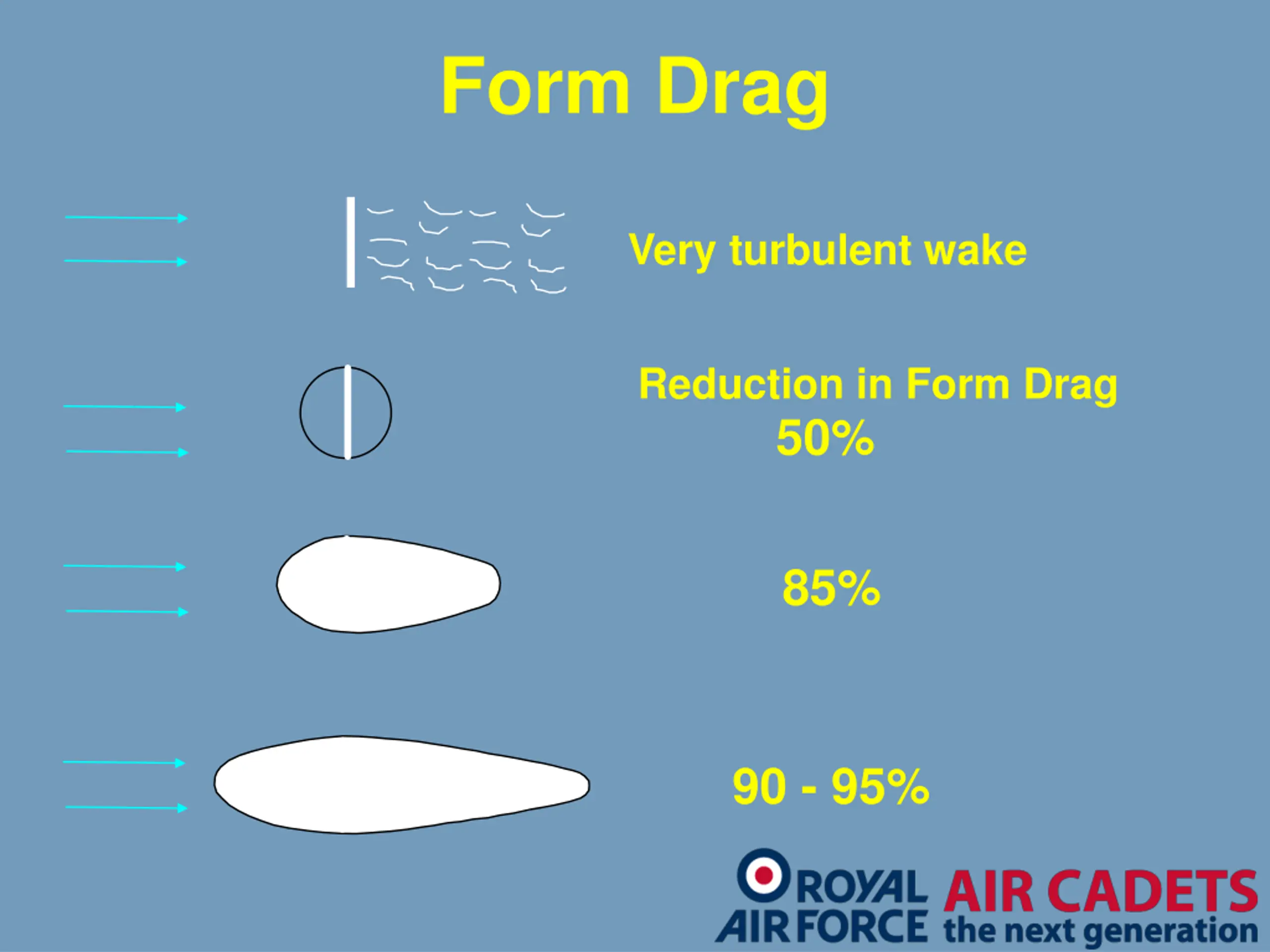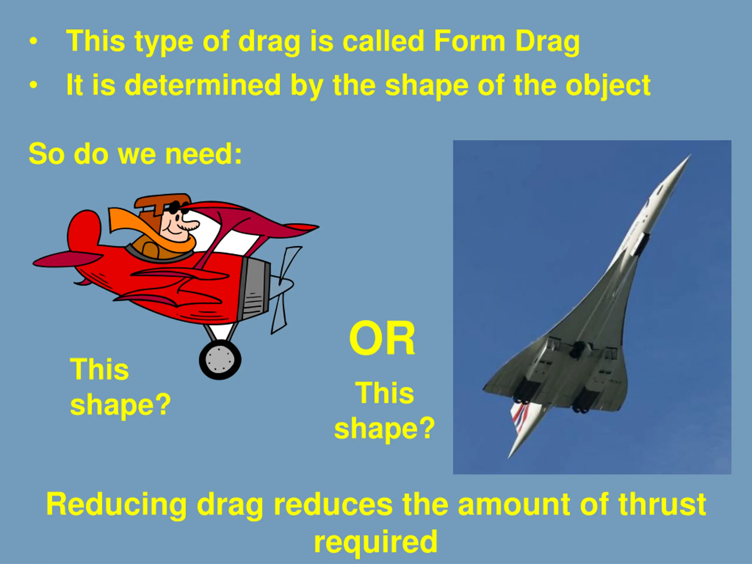 This type of drag is called Form Drag It is determined by the shape of the object So do we need: OR This shape? This shape? Reducing drag reduces the amount of thrust required