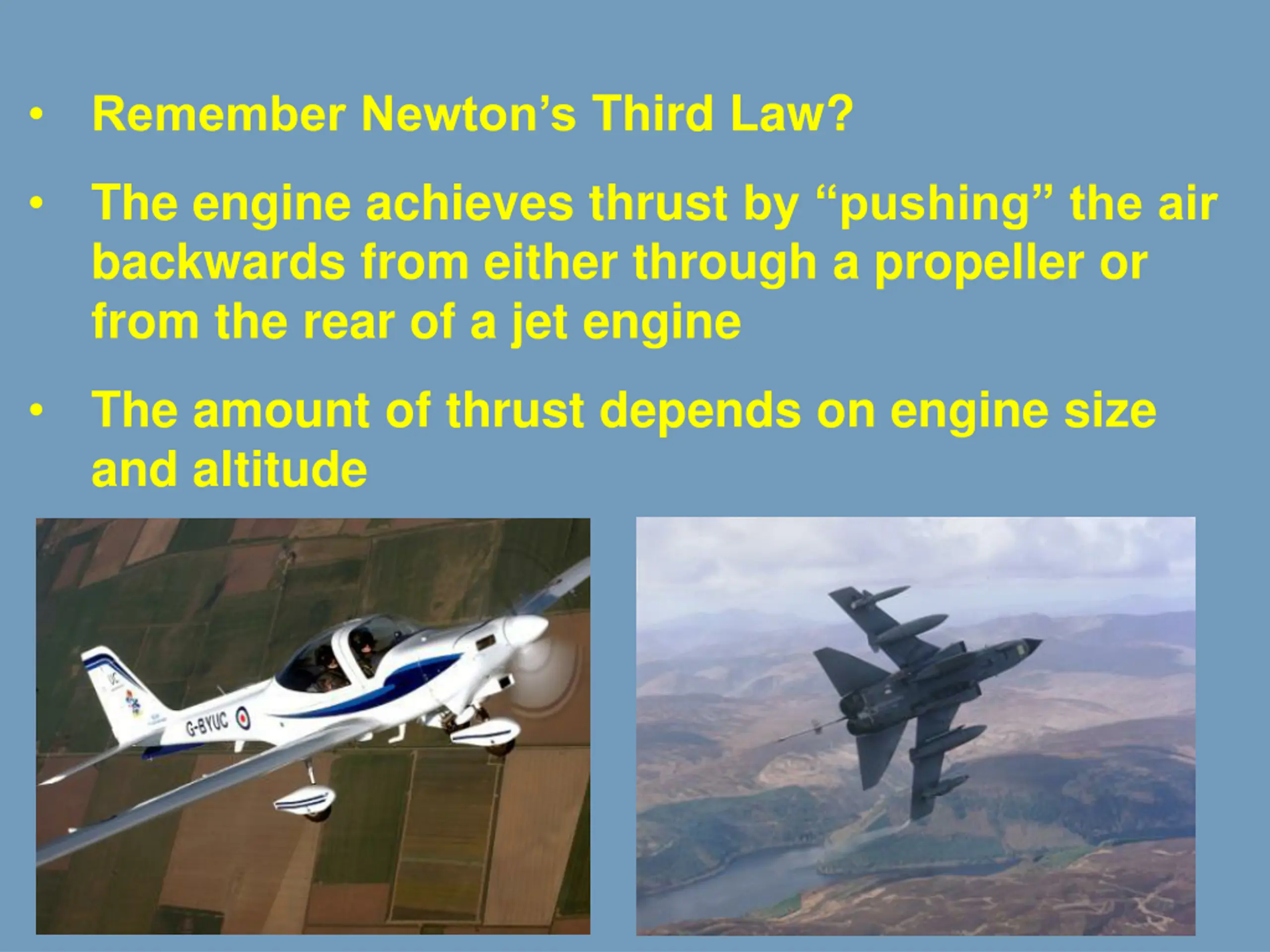 Remember Newtons Third Law? The engine achieves thrust by pushing the air backwards from either through a propeller or from the rear of a jet engine The amount of thrust depends on engine size and altitude