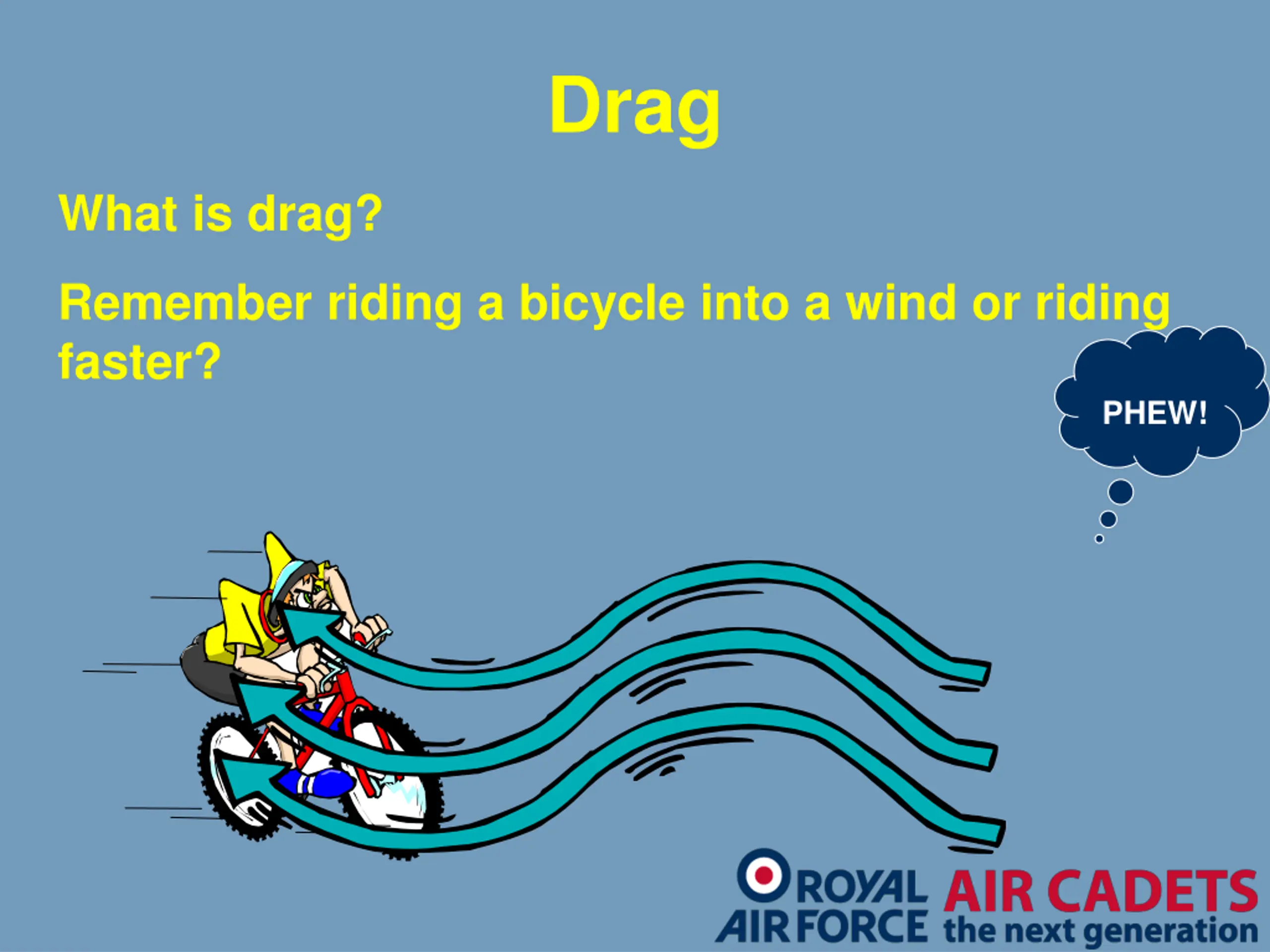 Drag What is drag? Remember riding a bicycle into a wind or riding faster? PHEW!