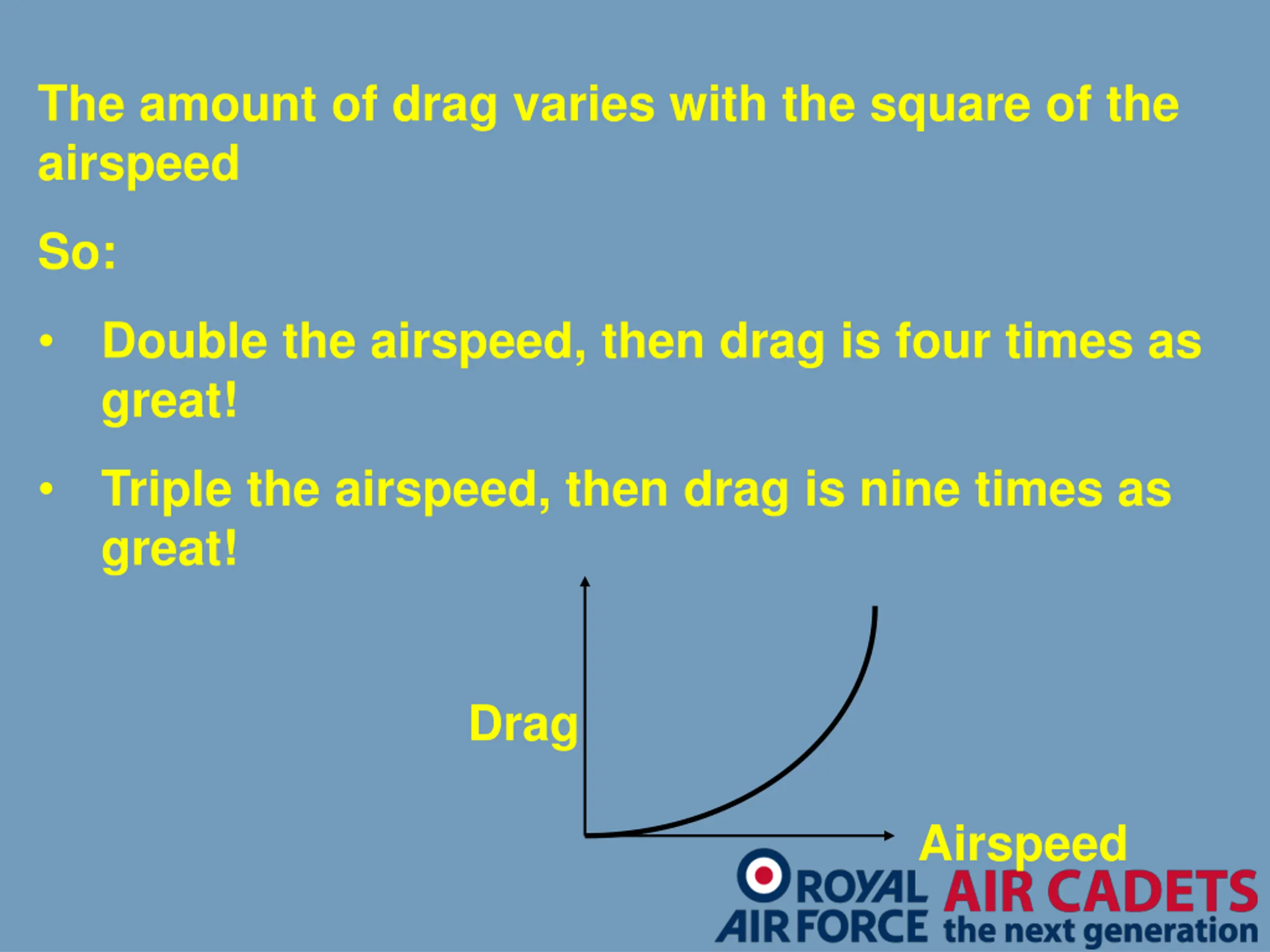 The amount of drag varies with the square of the airspeed So: Double the airspeed, then drag is four times as great! Triple the airspeed, then drag is nine times as great! Drag Airspeed