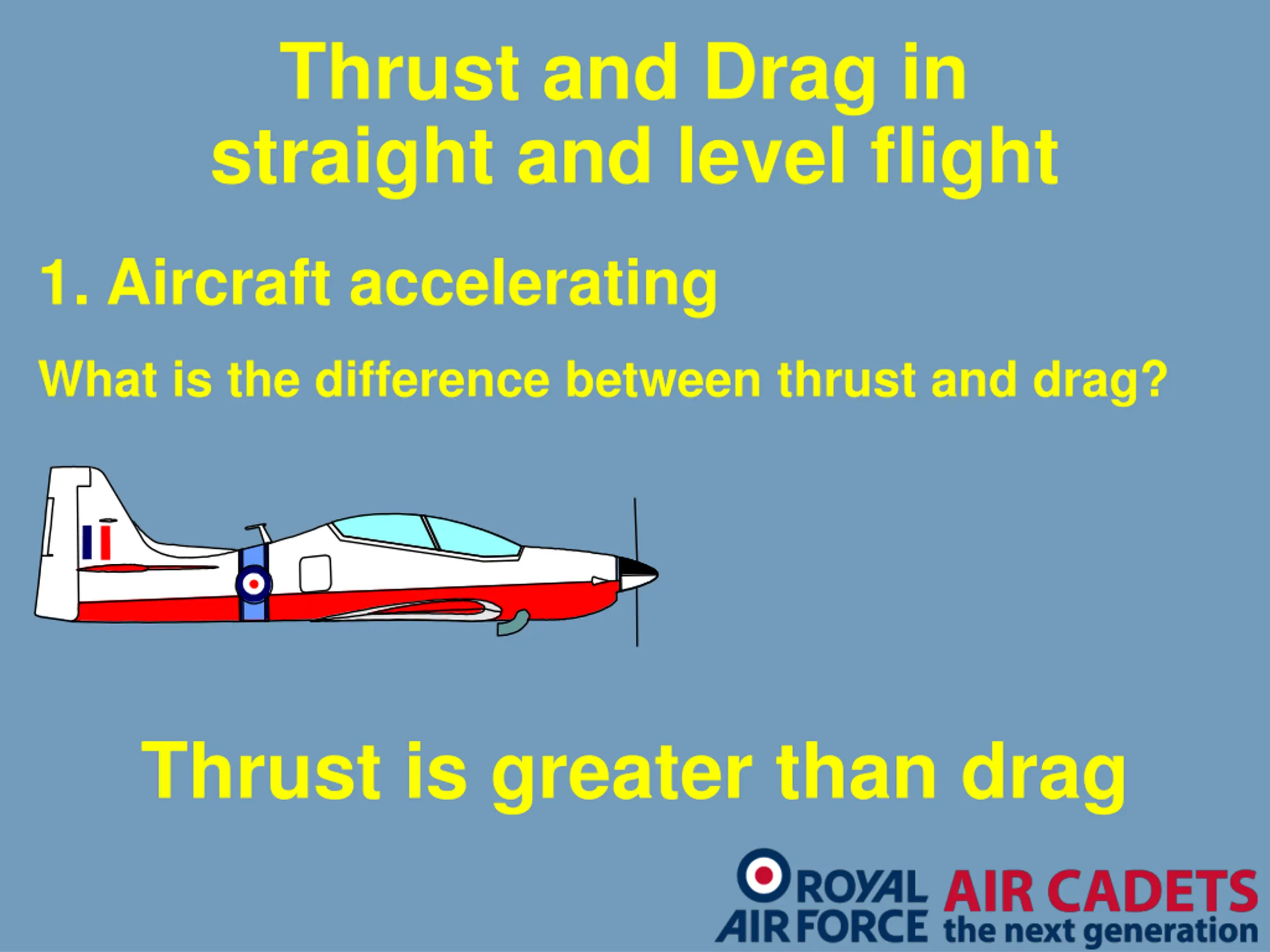Thrust and Drag in straight and level flight 1. Aircraft accelerating What is the difference between thrust and drag? Thrust is greater than drag