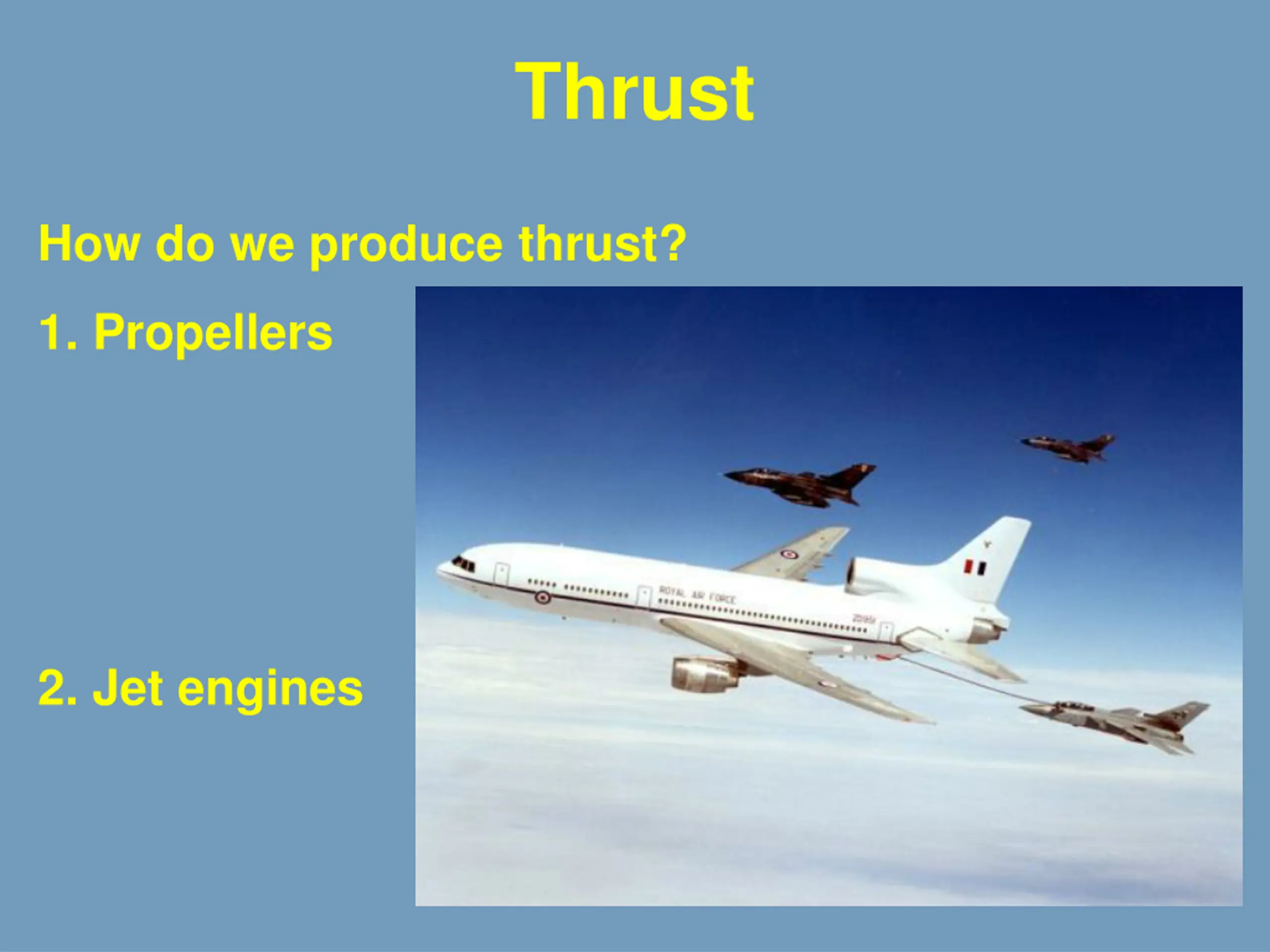 Thrust How do we produce thrust? 1. Propellers 2. Jet engines