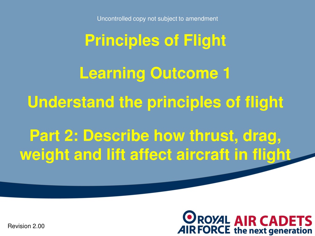 Uncontrolled copy not subject to amendment Principles of Flight Learning Outcome 1 Understand the principles of flight Part 2: Describe how thrust, drag, weight and lift affect aircraft in flight Revision 2.00