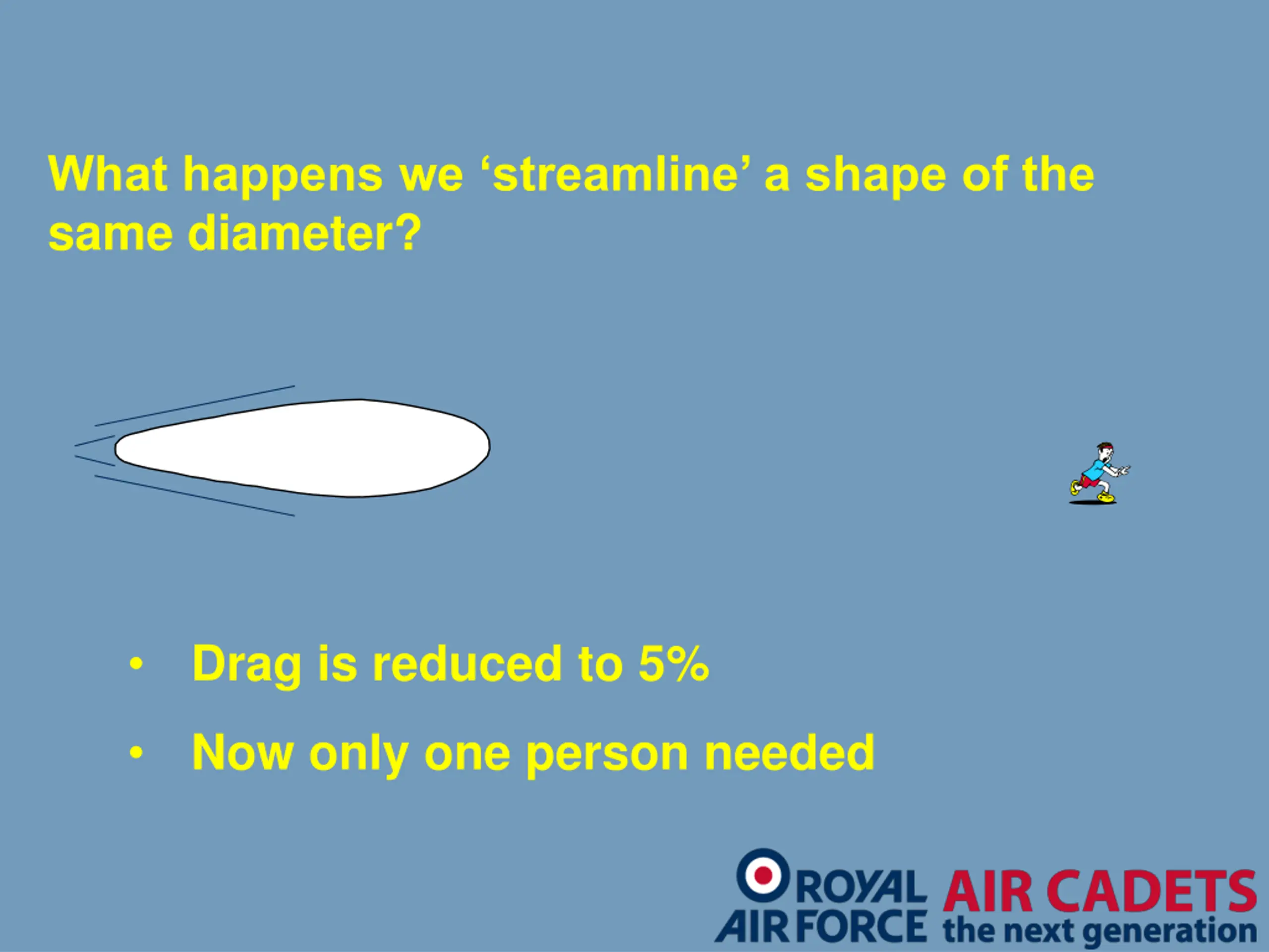 What happens we streamline a shape of the same diameter? Airflow Drag is reduced to 5% Now only one person needed