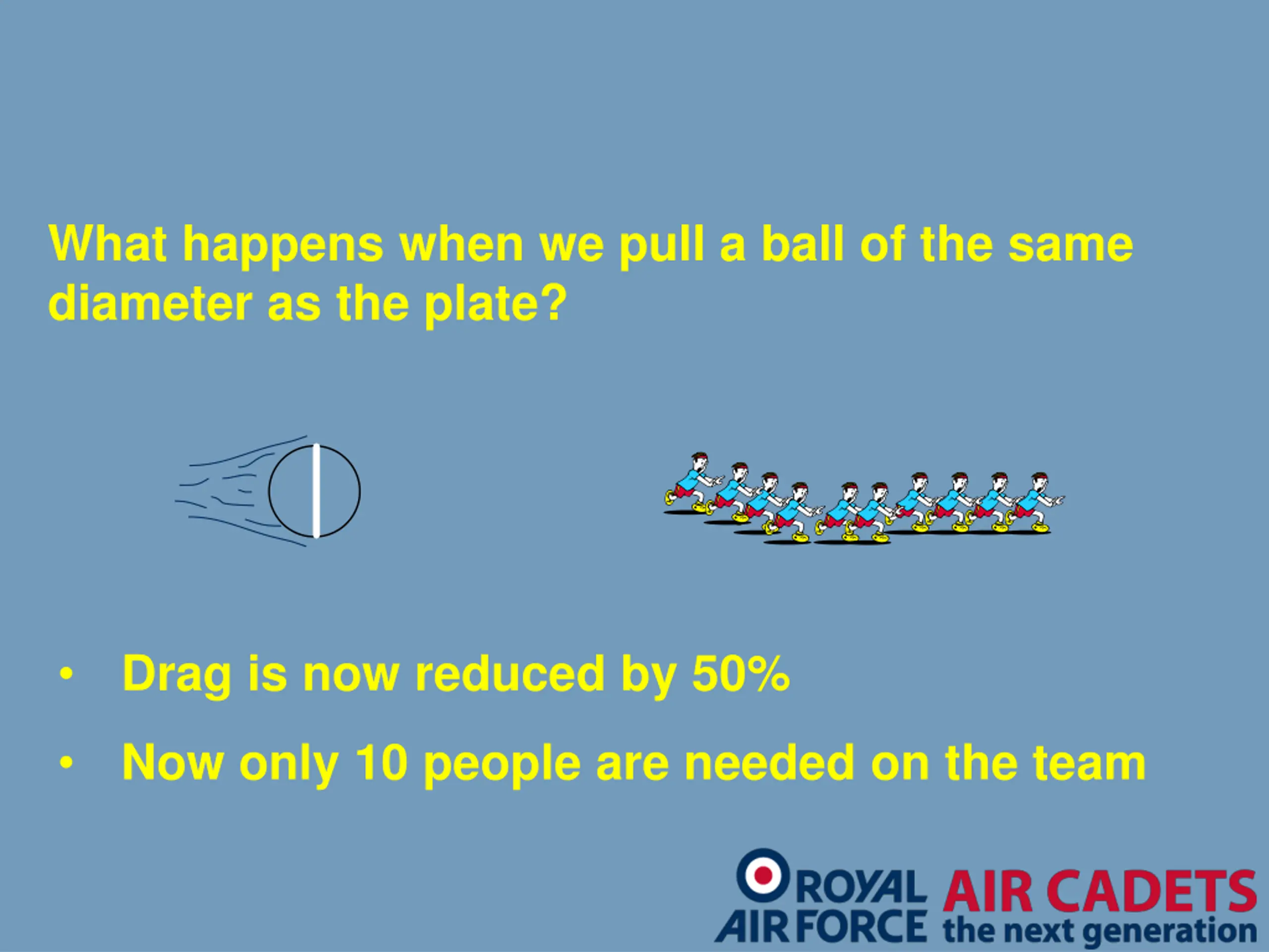 What happens when we pull a ball of the same diameter as the plate? Airflow Drag is now reduced by 50% Now only 10 people are needed on the team