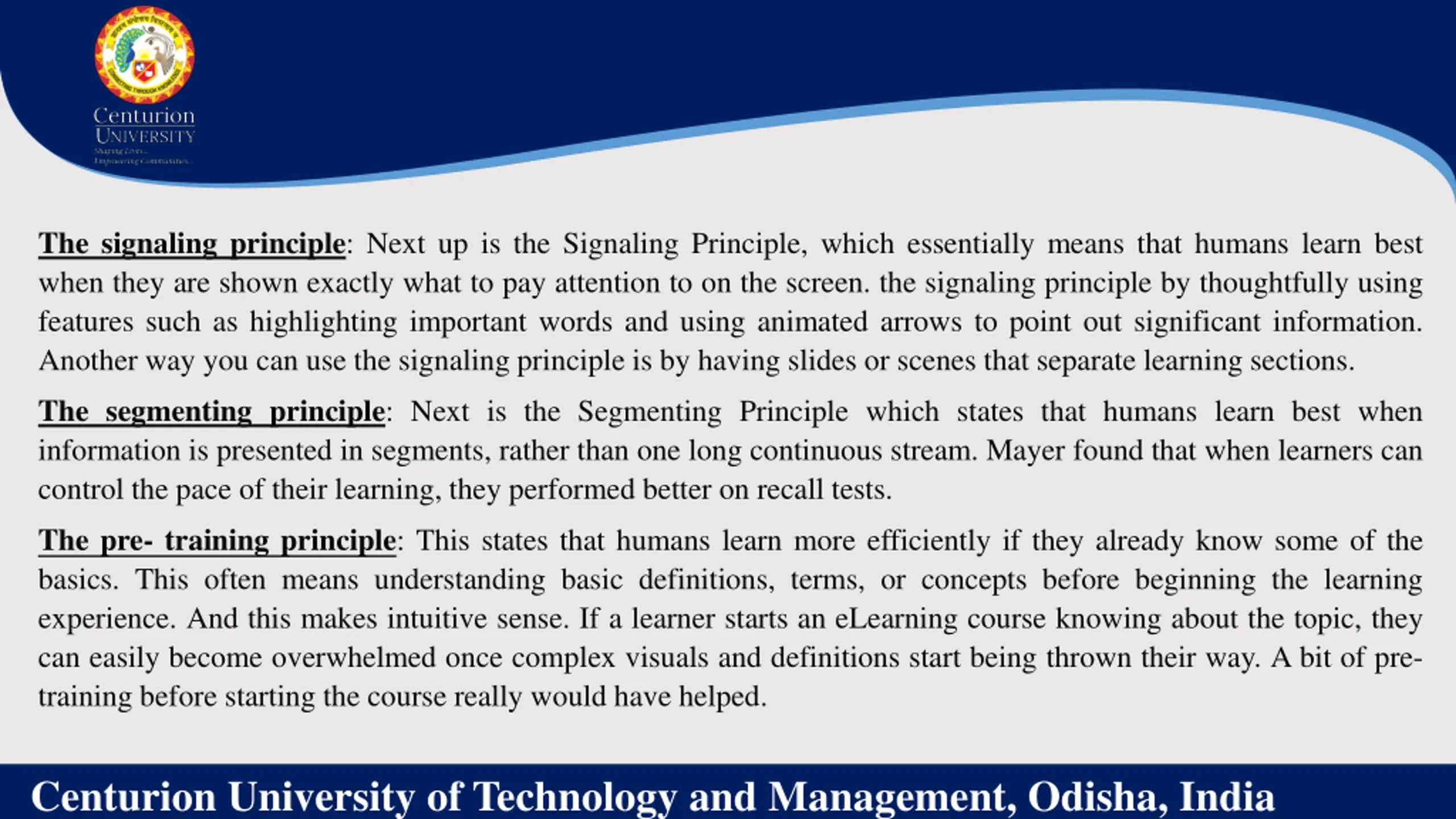 The signaling principle: Next up is the Signaling Principle, which essentially means that humans learn best when they are shown exactly what to pay attention to on the screen. the signaling principle by thoughtfully using features such as highlighting important words and using animated arrows to point out significant information. Another way you can use the signaling principle is by having slides or scenes that separate learning sections. The segmenting principle: Next is the Segmenting Principle which states that humans learn best when information is presented in segments, rather than one long continuous stream. Mayer found that when learners can control the pace of their learning, they performed better on recall tests. The pre- training principle: This states that humans learn more efficiently if they already know some of the basics. This often means understanding basic definitions, terms, or concepts before beginning the learning experience. And this makes intuitive sense. If a learner starts an eLearning course knowing about the topic, they can easily become overwhelmed once complex visuals and definitions start being thrown their way. A bit of pre- training before starting the course really would have helped. Centurion University of Technology and Management, Odisha, India