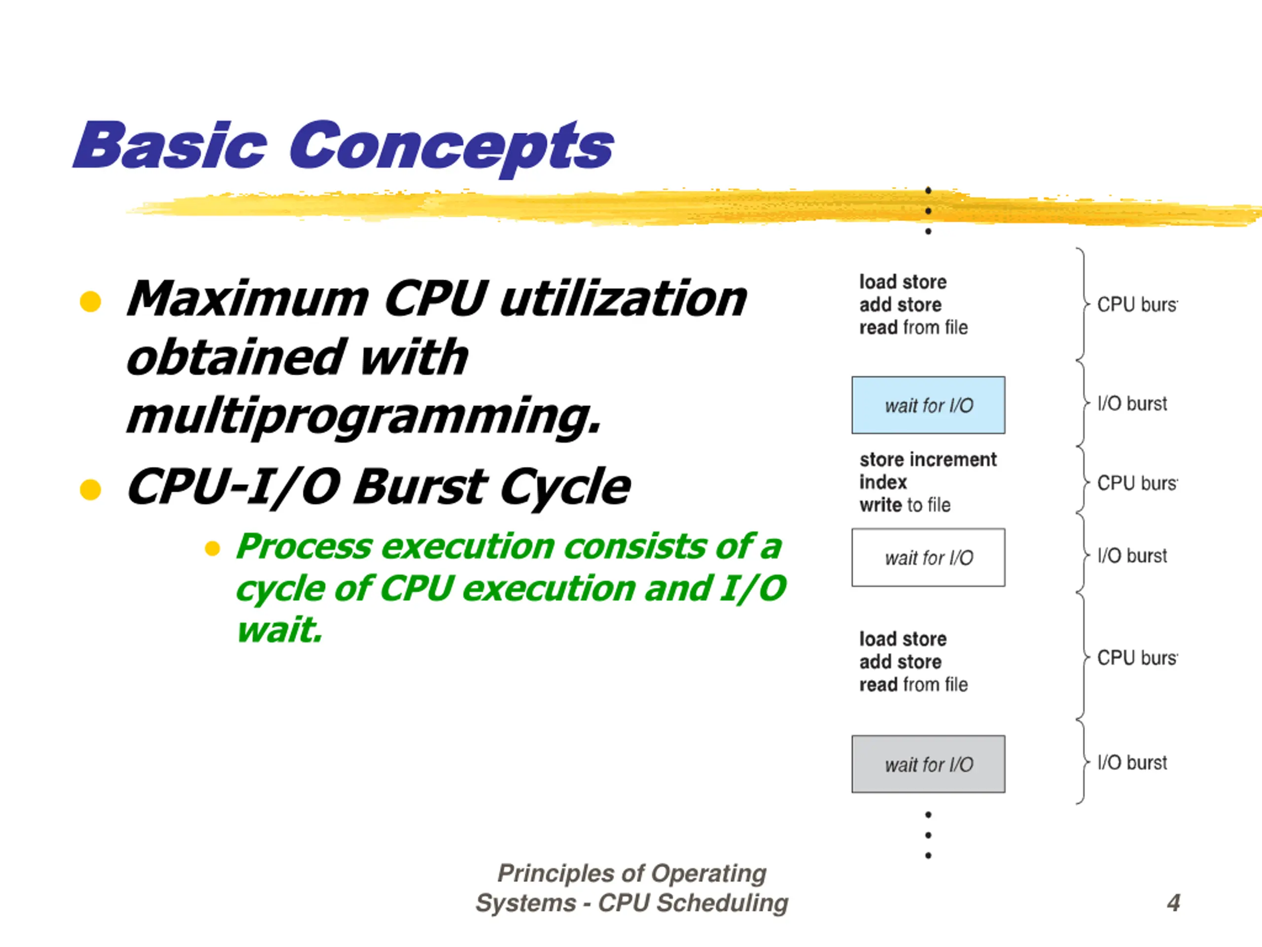 Basic Concepts Basic Concepts Maximum CPU utilization obtained with multiprogramming. CPU-I/O Burst Cycle Process execution consists of a cycle of CPU execution and I/O wait. Principles of Operating Systems - CPU Scheduling 4