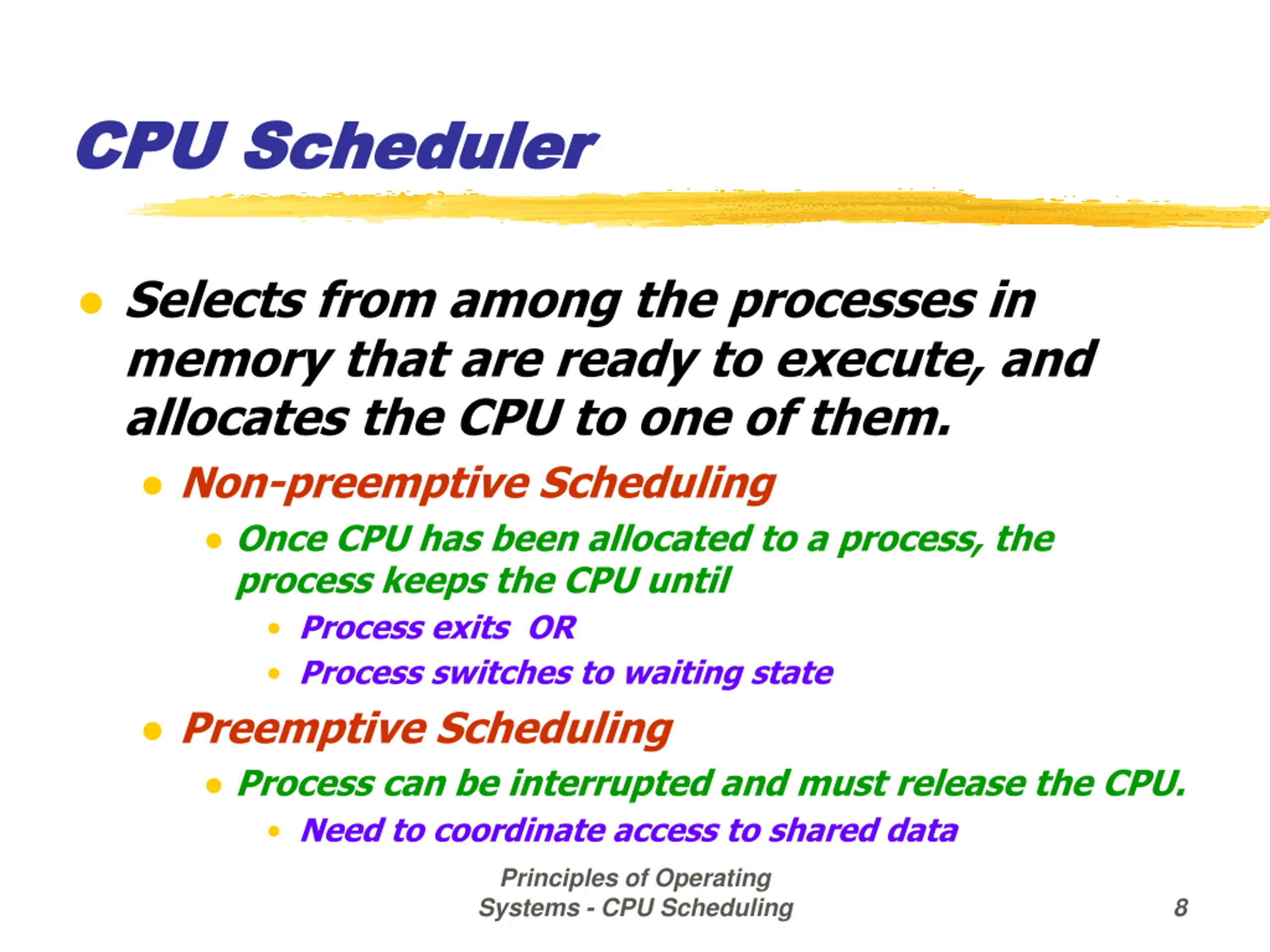 CPU Scheduler CPU Scheduler Selects from among the processes in memory that are ready to execute, and allocates the CPU to one of them. Non-preemptive Scheduling Once CPU has been allocated to a process, the process keeps the CPU until Process exits OR Process switches to waiting state Preemptive Scheduling Process can be interrupted and must release the CPU. Need to coordinate access to shared data Principles of Operating Systems - CPU Scheduling 8