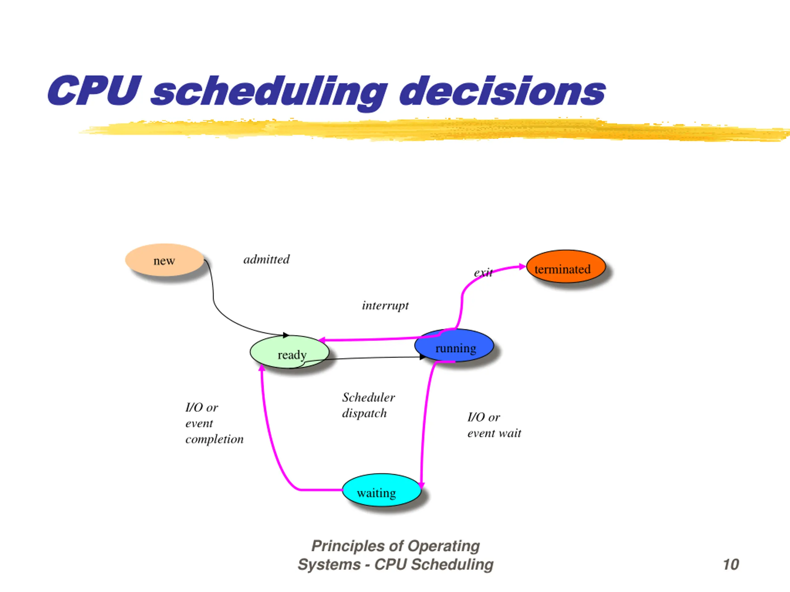 CPU scheduling decisions CPU scheduling decisions admitted new terminated exit interrupt running ready Scheduler dispatch I/O or event completion I/O or event wait waiting Principles of Operating Systems - CPU Scheduling 10