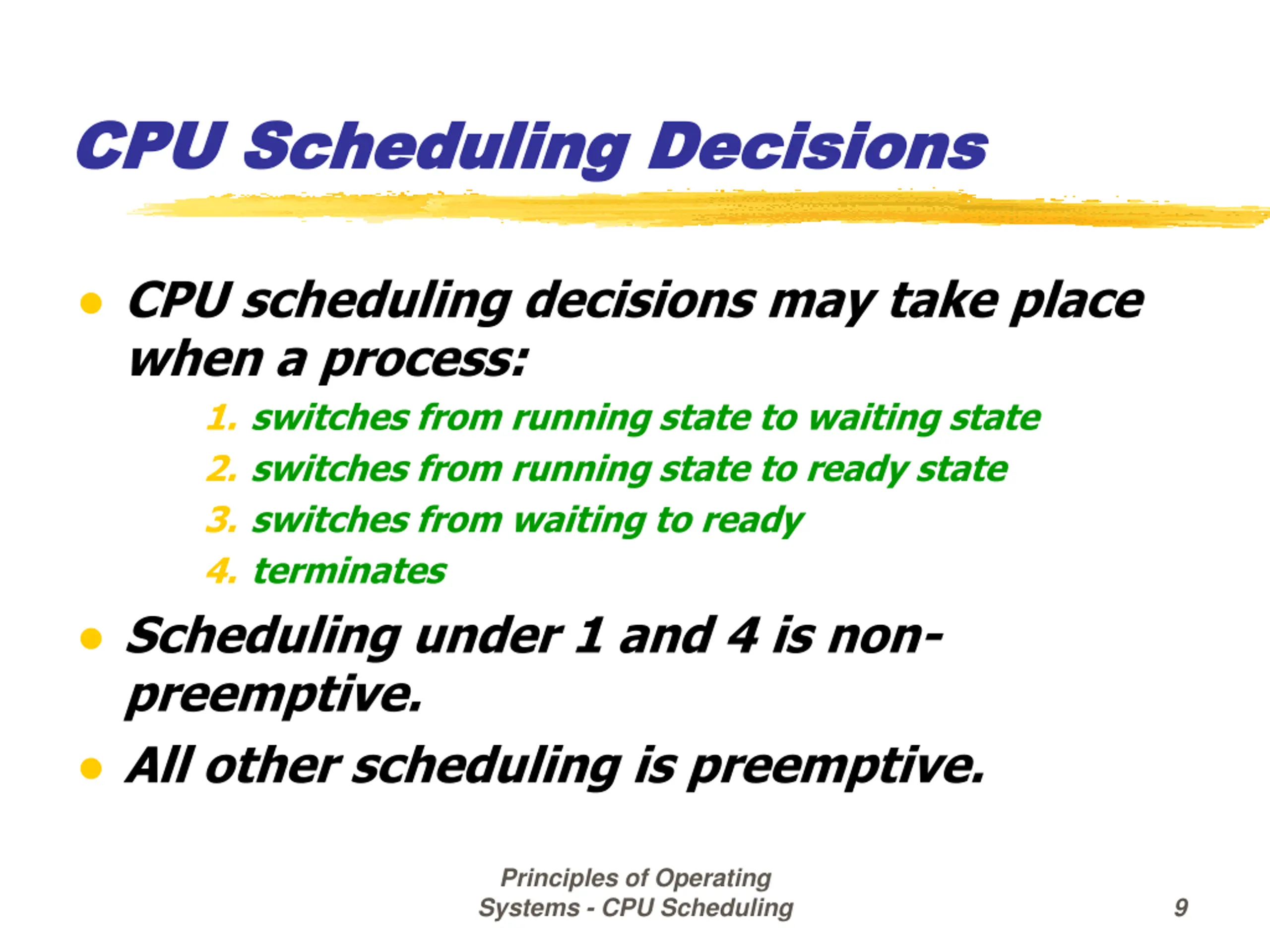 CPU Scheduling Decisions CPU Scheduling Decisions CPU scheduling decisions may take place when a process: 1. switches from running state to waiting state 2. switches from running state to ready state 3. switches from waiting to ready 4. terminates Scheduling under 1 and 4 is non- preemptive. All other scheduling is preemptive. Principles of Operating Systems - CPU Scheduling 9