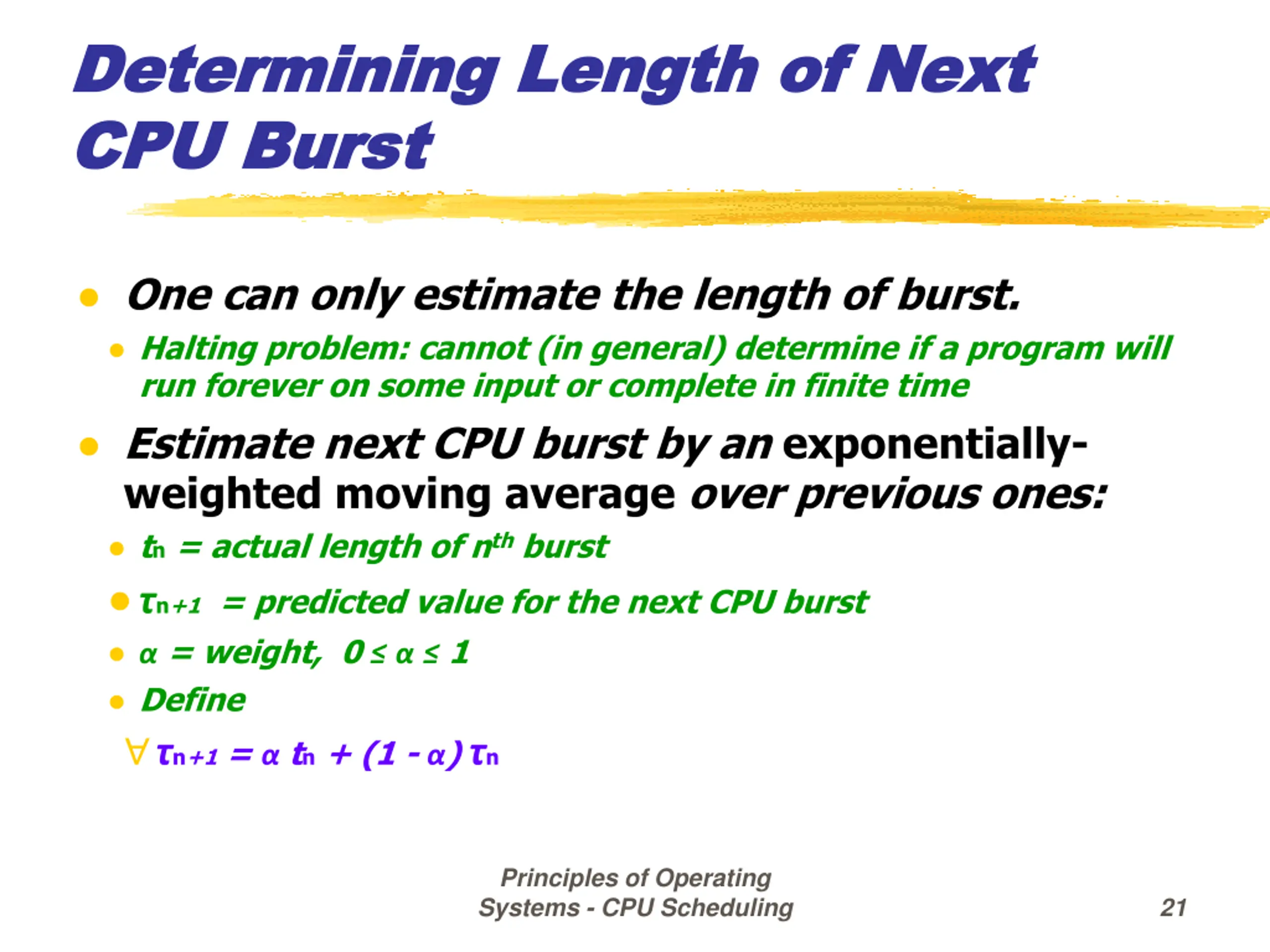 Determining Length of Next Determining Length of Next CPU Burst CPU Burst One can only estimate the length of burst. Halting problem: cannot (in general) determine if a program will run forever on some input or complete in finite time Estimate next CPU burst by an exponentially- weighted moving average over previous ones: tn = actual length of nthburst n+1 = predicted value for the next CPU burst = weight, 0 1 Define n+1 = tn + (1 - ) n Principles of Operating Systems - CPU Scheduling 21