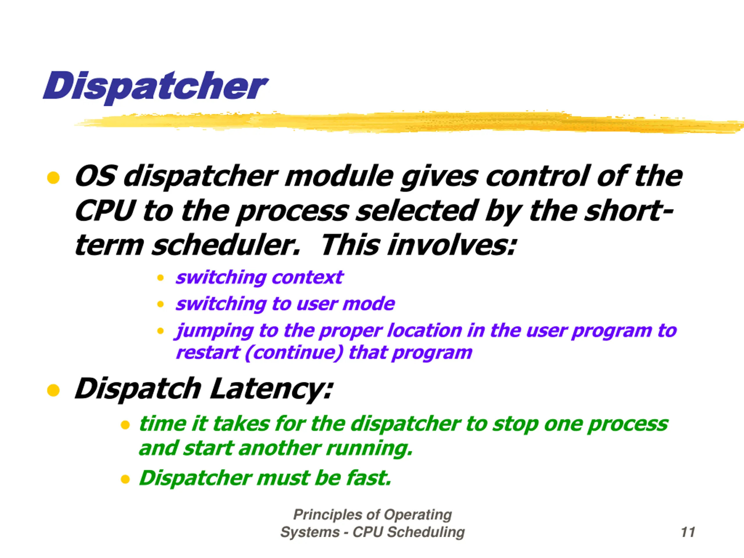 Dispatcher Dispatcher OS dispatcher module gives control of the CPU to the process selected by the short- term scheduler. This involves: switching context switching to user mode jumping to the proper location in the user program to restart (continue) that program Dispatch Latency: time it takes for the dispatcher to stop one process and start another running. Dispatcher must be fast. Principles of Operating Systems - CPU Scheduling 11