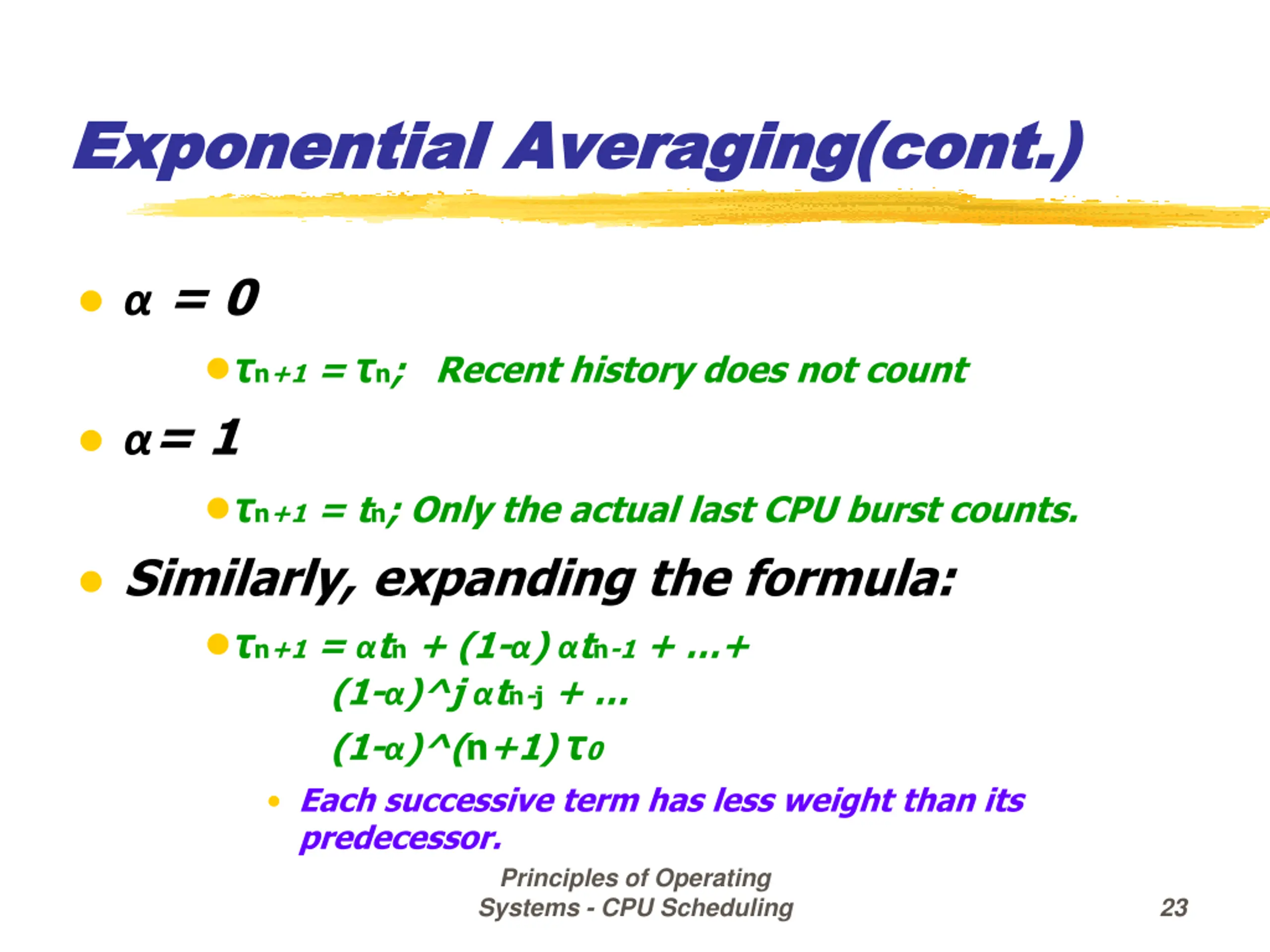 Exponential Averaging(cont.) Exponential Averaging(cont.) = 0 n+1 = n; Recent history does not count = 1 n+1 = tn; Only the actual last CPU burst counts. Similarly, expanding the formula: n+1 = tn + (1- ) tn-1 + + (1- )^j tn-j + (1- )^(n+1) 0 Each successive term has less weight than its predecessor. Principles of Operating Systems - CPU Scheduling 23