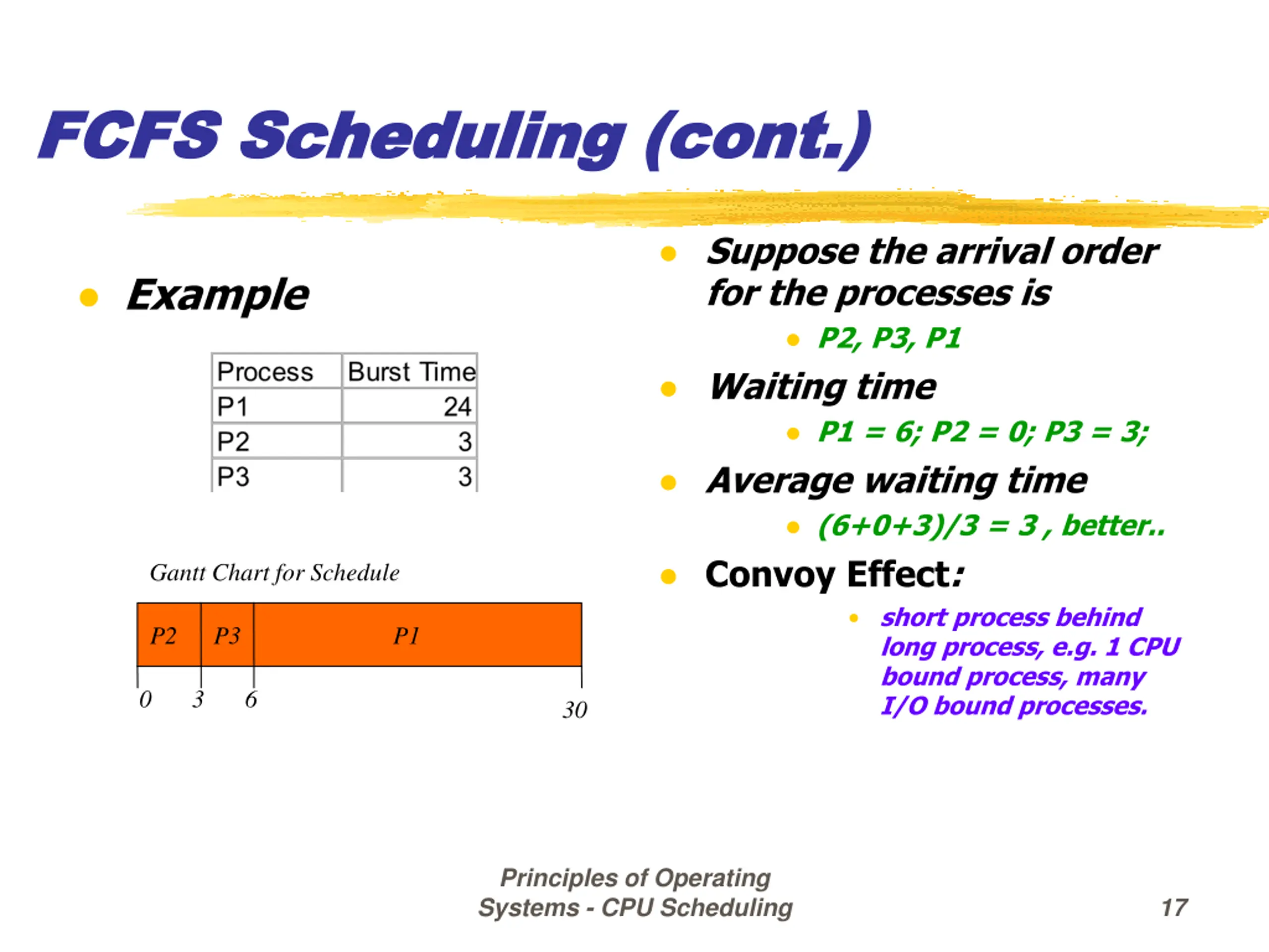 FCFS Scheduling (cont.) FCFS Scheduling (cont.) Suppose the arrival order for the processes is P2, P3, P1 Waiting time P1 = 6; P2 = 0; P3 = 3; Average waiting time (6+0+3)/3 = 3 , better.. Convoy Effect: short process behind long process, e.g. 1 CPU bound process, many I/O bound processes. Example Gantt Chart for Schedule P2 P3 P1 0 3 6 30 Principles of Operating Systems - CPU Scheduling 17