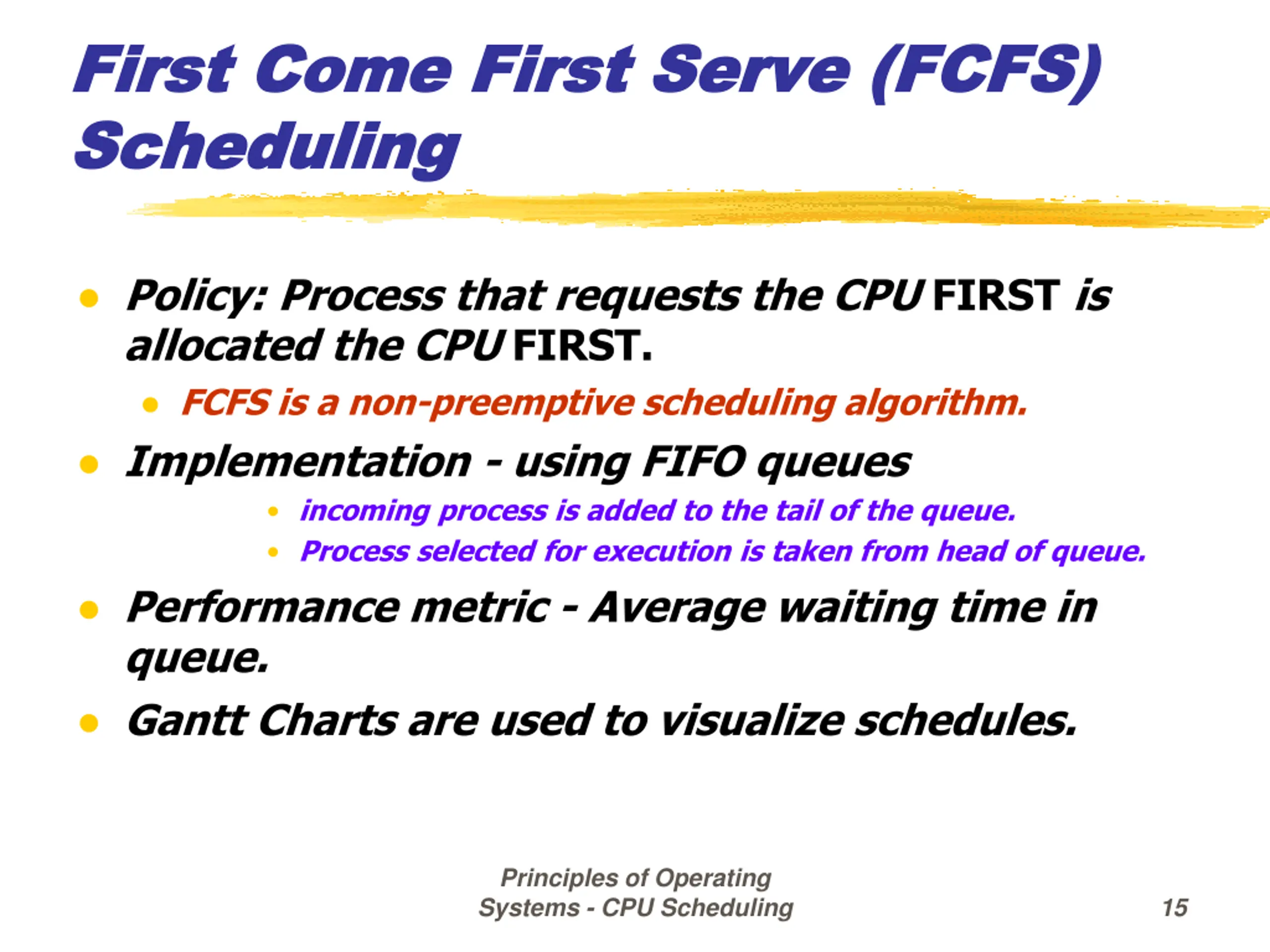 First Come First Serve (FCFS) First Come First Serve (FCFS) Scheduling Scheduling Policy: Process that requests the CPU FIRST is allocated the CPU FIRST. FCFS is a non-preemptive scheduling algorithm. Implementation - using FIFO queues incoming process is added to the tail of the queue. Process selected for execution is taken from head of queue. Performance metric - Average waiting time in queue. Gantt Charts are used to visualize schedules. Principles of Operating Systems - CPU Scheduling 15