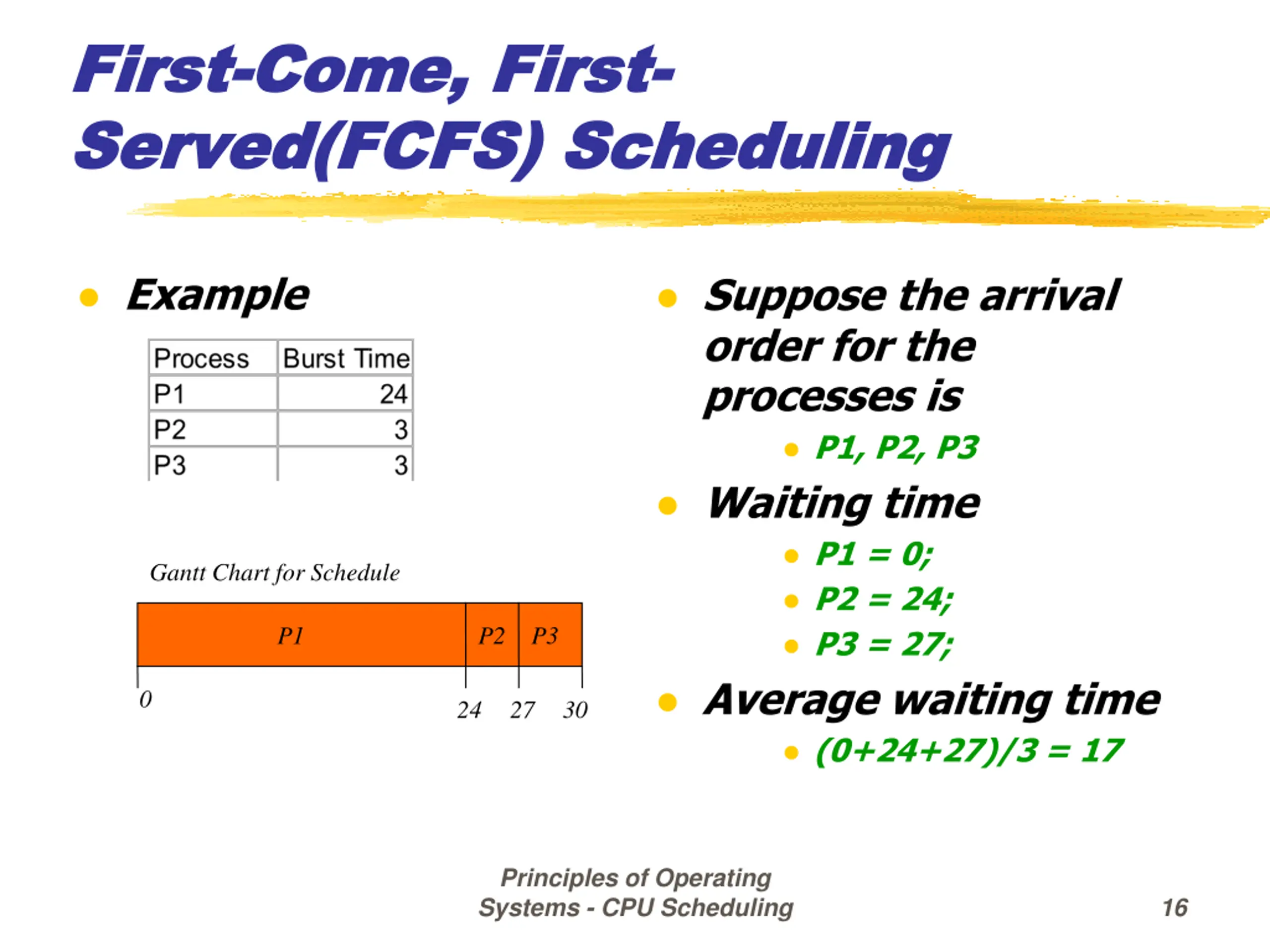 First First- -Come, First Come, First- - Served(FCFS) Scheduling Served(FCFS) Scheduling Example Suppose the arrival order for the processes is P1, P2, P3 Waiting time P1 = 0; P2 = 24; P3 = 27; Average waiting time (0+24+27)/3 = 17 Gantt Chart for Schedule P1 P2 P3 0 24 27 30 Principles of Operating Systems - CPU Scheduling 16