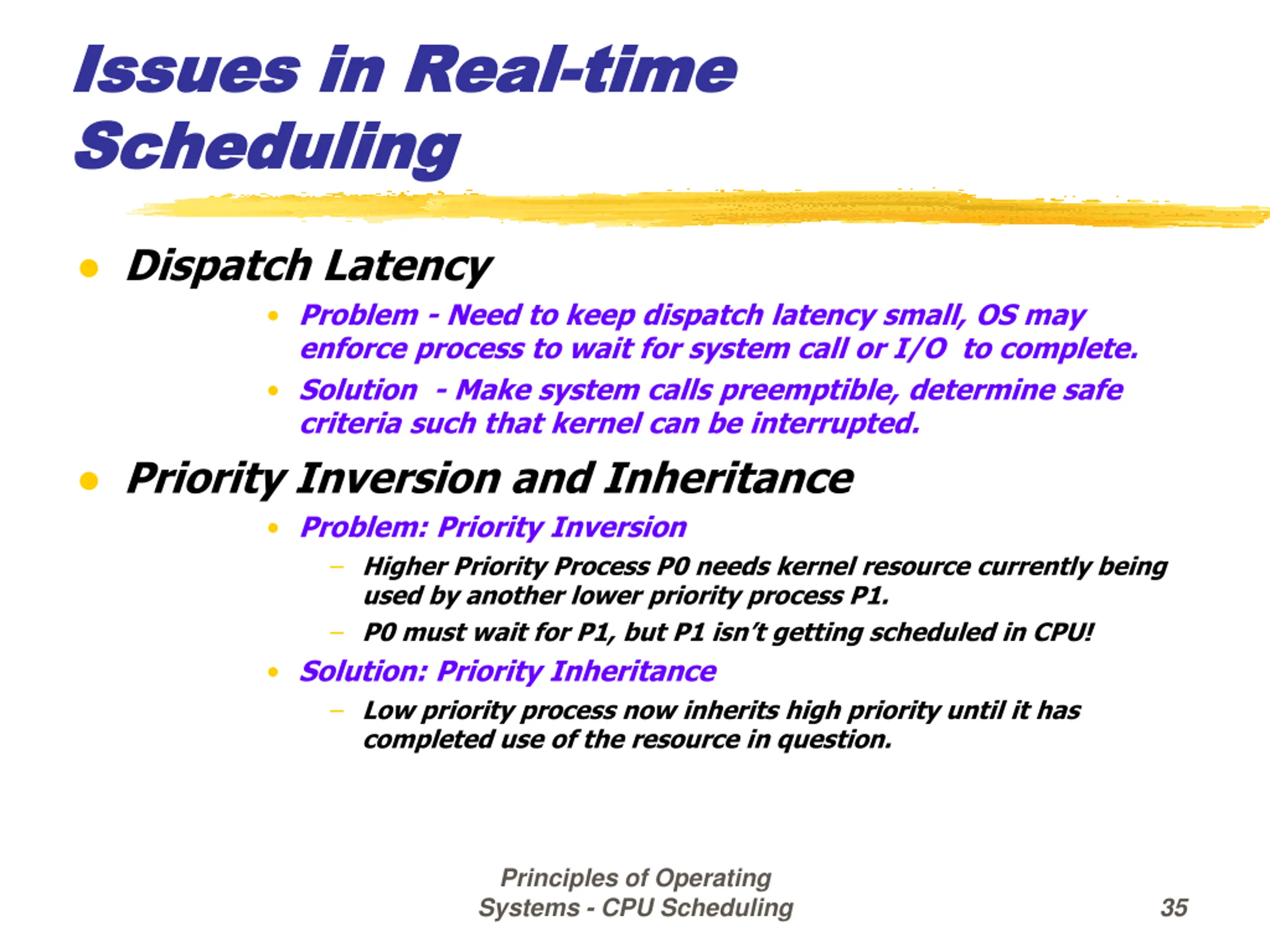 Issues in Real Issues in Real- -time Scheduling Scheduling time Dispatch Latency Problem - Need to keep dispatch latency small, OS may enforce process to wait for system call or I/O to complete. Solution - Make system calls preemptible, determine safe criteria such that kernel can be interrupted. Priority Inversion and Inheritance Problem: Priority Inversion Higher Priority Process P0 needs kernel resource currently being used by another lower priority process P1. P0 must wait for P1, but P1 isn t getting scheduled in CPU! Solution: Priority Inheritance Low priority process now inherits high priority until it has completed use of the resource in question. Principles of Operating Systems - CPU Scheduling 35