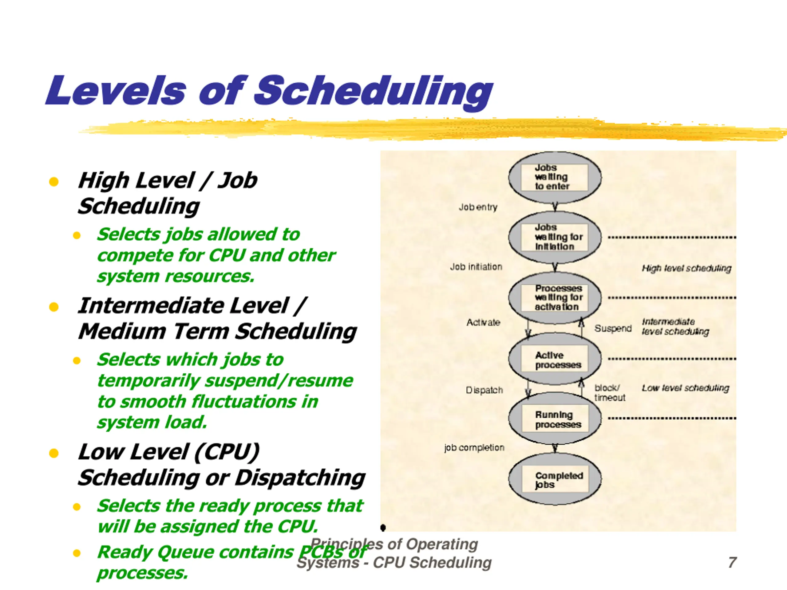 Levels of Scheduling Levels of Scheduling High Level / Job Scheduling Selects jobs allowed to compete for CPU and other system resources. Intermediate Level / Medium Term Scheduling Selects which jobs to temporarily suspend/resume to smooth fluctuations in system load. Low Level (CPU) Scheduling or Dispatching Selects the ready process that will be assigned the CPU. Ready Queue contains PCBs of processes. Principles of Operating Systems - CPU Scheduling 7