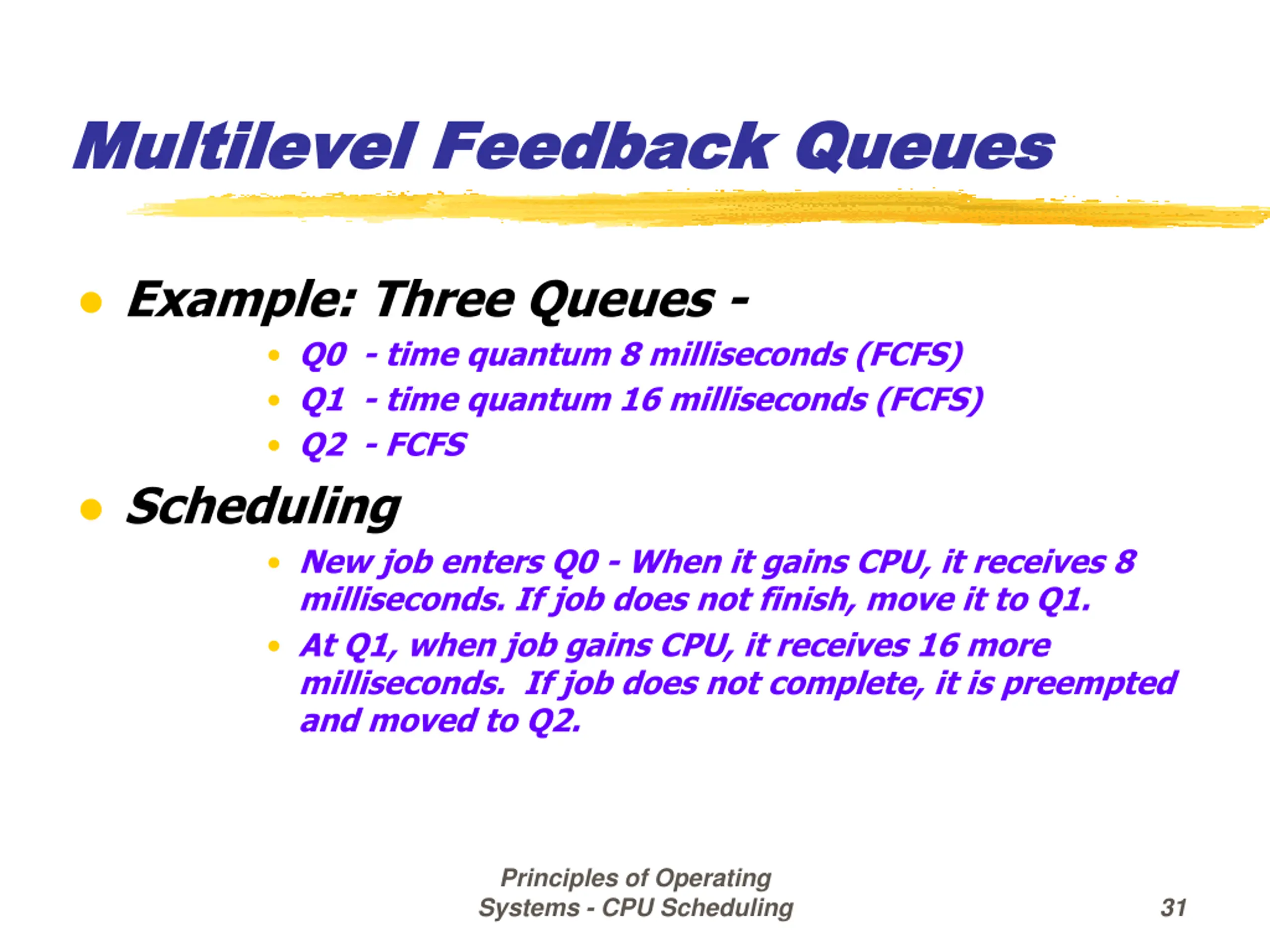 Multilevel Feedback Queues Multilevel Feedback Queues Example: Three Queues - Q0 - time quantum 8 milliseconds (FCFS) Q1 - time quantum 16 milliseconds (FCFS) Q2 - FCFS Scheduling New job enters Q0 - When it gains CPU, it receives 8 milliseconds. If job does not finish, move it to Q1. At Q1, when job gains CPU, it receives 16 more milliseconds. If job does not complete, it is preempted and moved to Q2. Principles of Operating Systems - CPU Scheduling 31