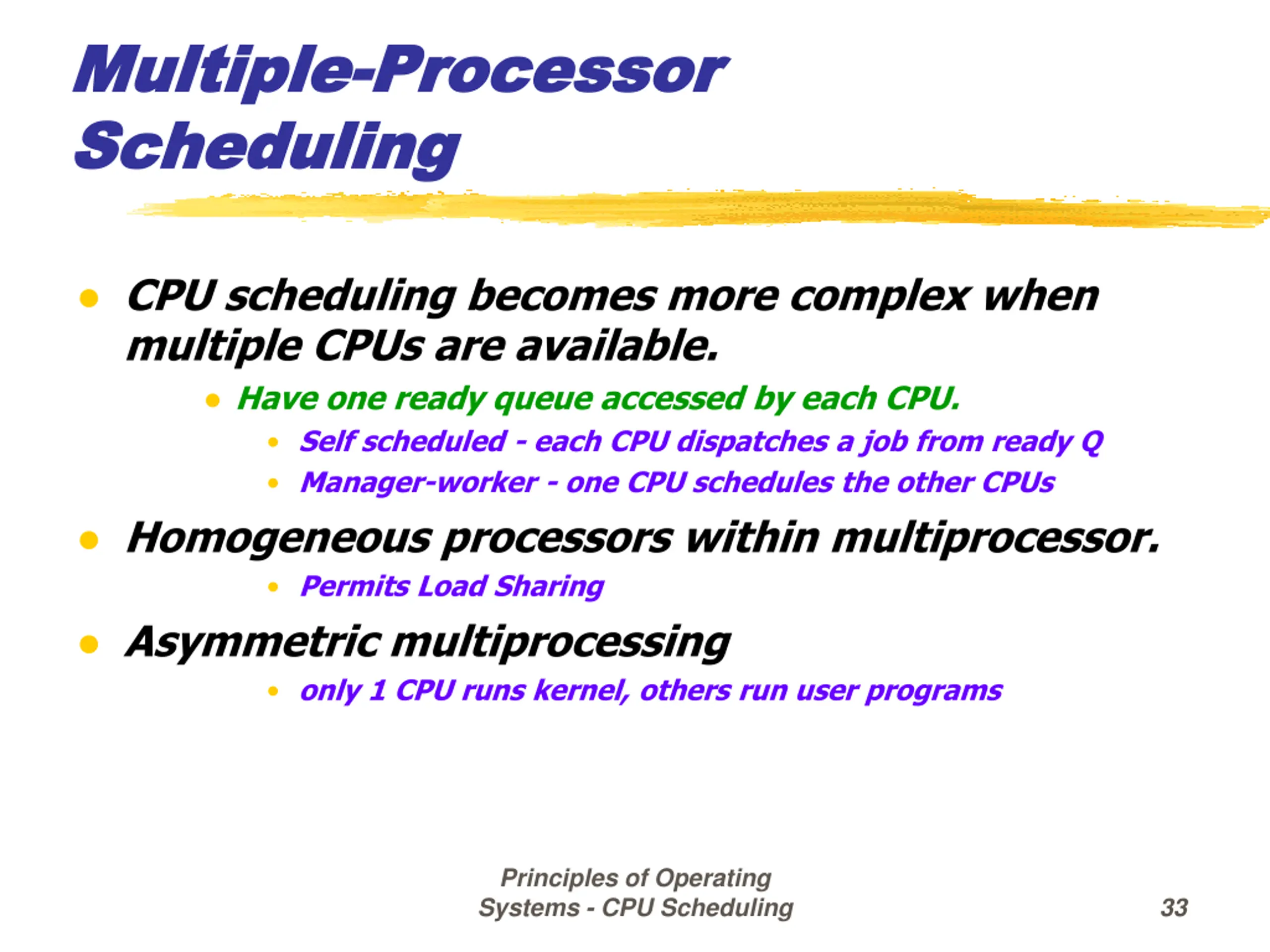 Multiple Multiple- -Processor Processor Scheduling Scheduling CPU scheduling becomes more complex when multiple CPUs are available. Have one ready queue accessed by each CPU. Self scheduled - each CPU dispatches a job from ready Q Manager-worker - one CPU schedules the other CPUs Homogeneous processors within multiprocessor. Permits Load Sharing Asymmetric multiprocessing only 1 CPU runs kernel, others run user programs Principles of Operating Systems - CPU Scheduling 33