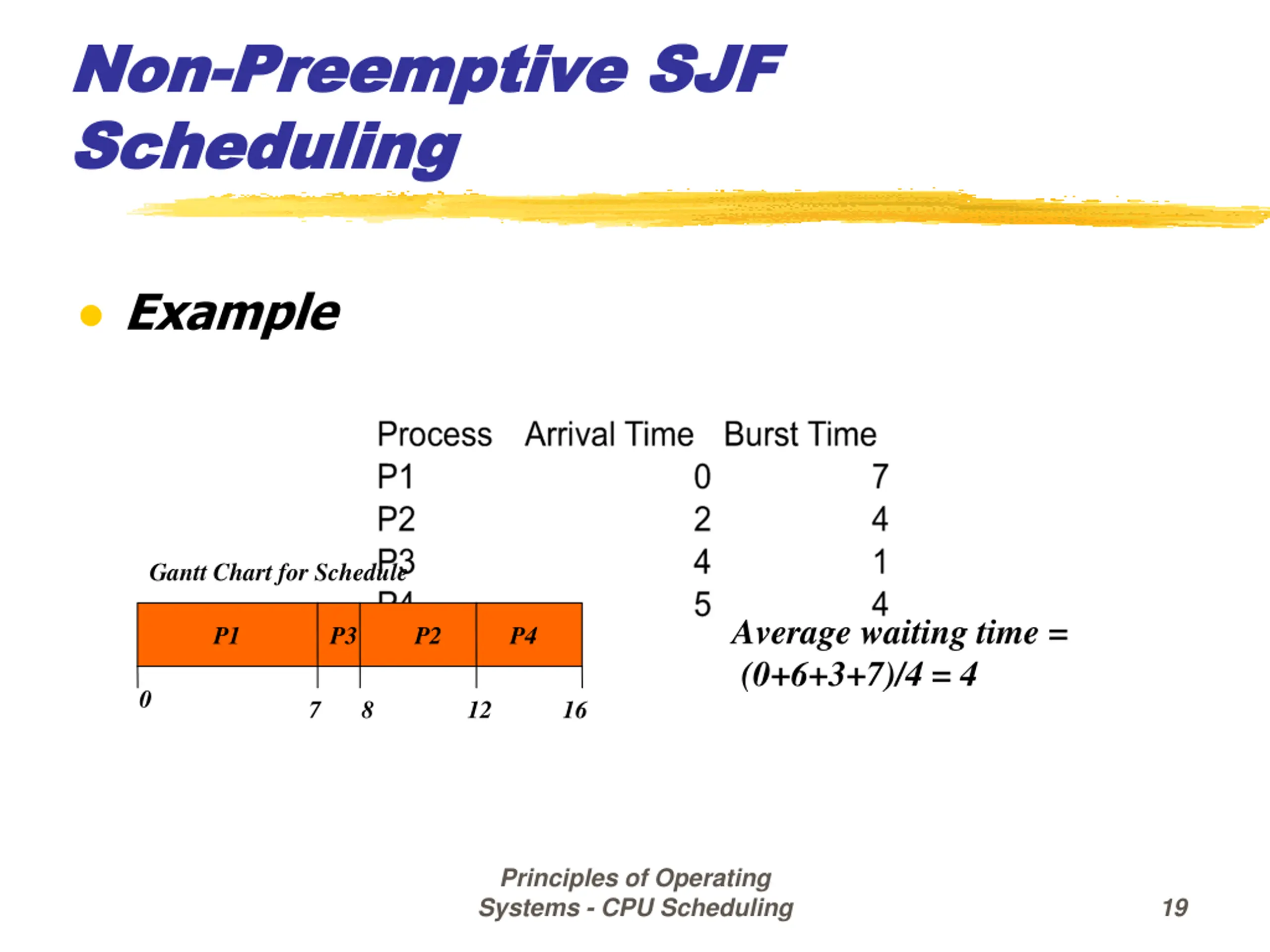 Non Non- -Preemptive SJF Preemptive SJF Scheduling Scheduling Example Gantt Chart for Schedule Average waiting time = (0+6+3+7)/4 = 4 P1 P3 P2 P4 0 7 8 12 16 Principles of Operating Systems - CPU Scheduling 19