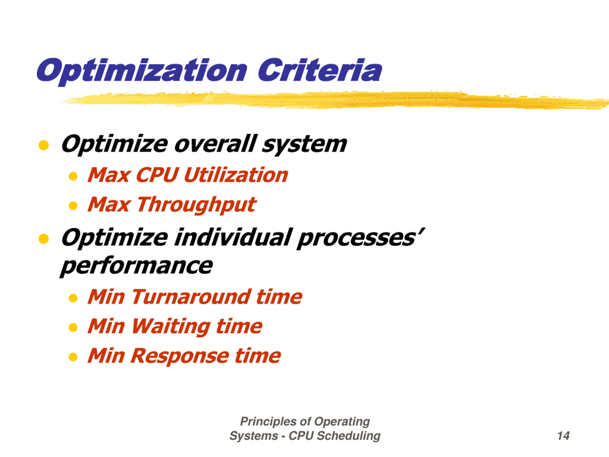 Optimization Criteria Optimization Criteria Optimize overall system Max CPU Utilization Max Throughput Optimize individual processes performance Min Turnaround time Min Waiting time Min Response time Principles of Operating Systems - CPU Scheduling 14