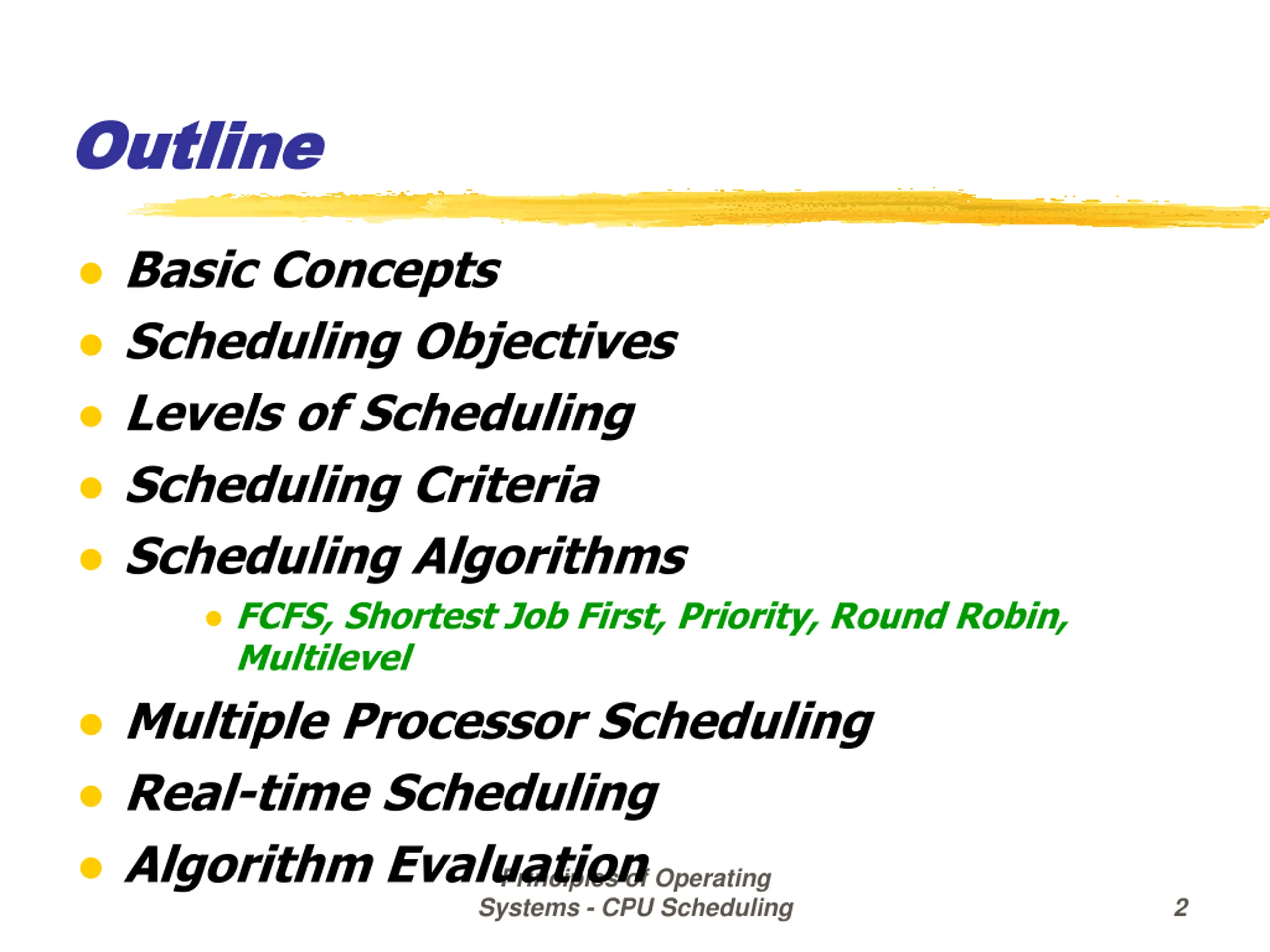 Outline Outline Basic Concepts Scheduling Objectives Levels of Scheduling Scheduling Criteria Scheduling Algorithms FCFS, Shortest Job First, Priority, Round Robin, Multilevel Multiple Processor Scheduling Real-time Scheduling Algorithm Evaluation Principles of Operating Systems - CPU Scheduling 2