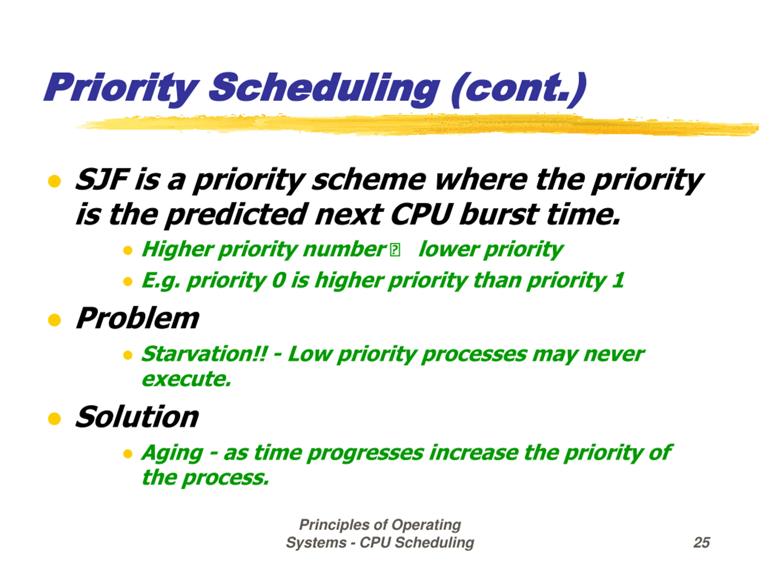 Priority Scheduling (cont.) Priority Scheduling (cont.) SJF is a priority scheme where the priority is the predicted next CPU burst time. Higher priority number ? lower priority E.g. priority 0 is higher priority than priority 1 Problem Starvation!! - Low priority processes may never execute. Solution Aging - as time progresses increase the priority of the process. Principles of Operating Systems - CPU Scheduling 25