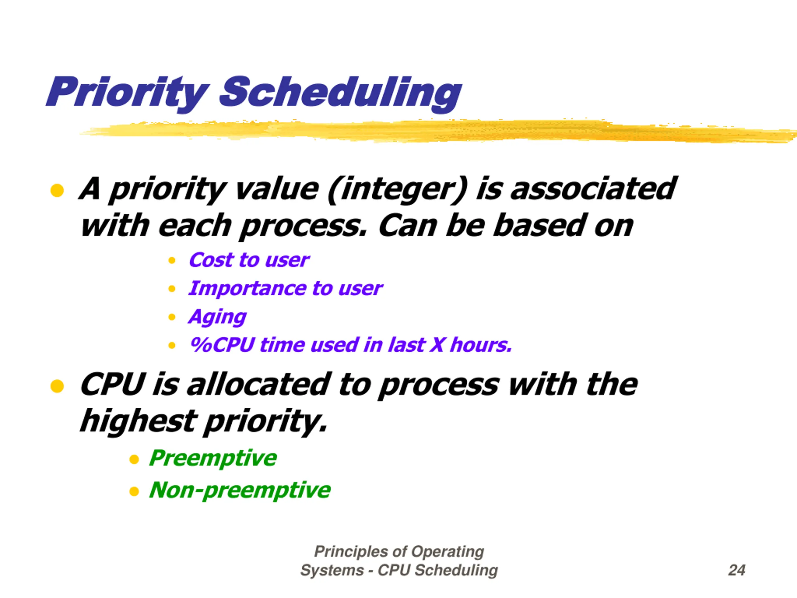 Priority Scheduling Priority Scheduling A priority value (integer) is associated with each process. Can be based on Cost to user Importance to user Aging %CPU time used in last X hours. CPU is allocated to process with the highest priority. Preemptive Non-preemptive Principles of Operating Systems - CPU Scheduling 24