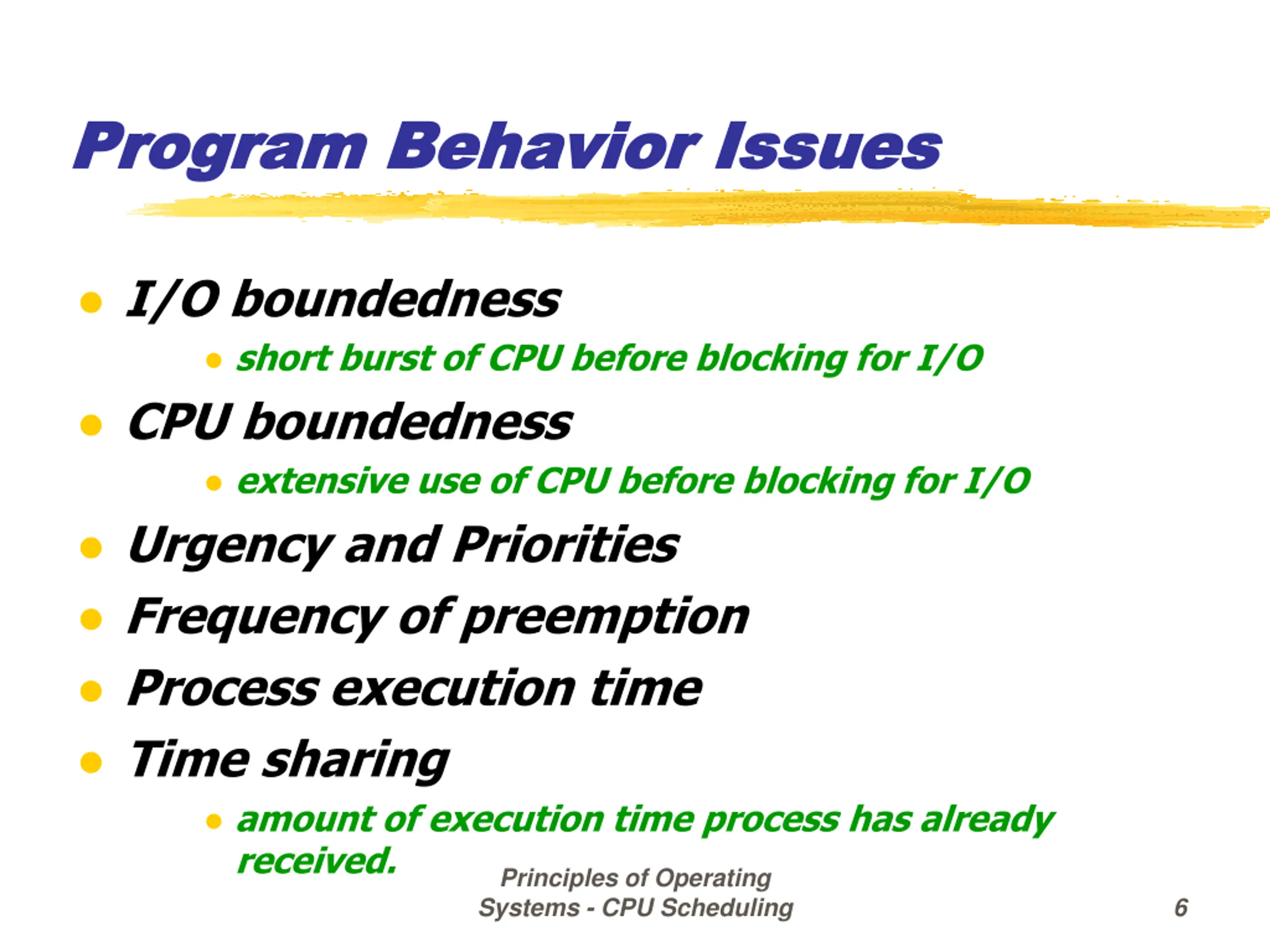 Program Behavior Issues Program Behavior Issues I/O boundedness short burst of CPU before blocking for I/O CPU boundedness extensive use of CPU before blocking for I/O Urgency and Priorities Frequency of preemption Process execution time Time sharing amount of execution time process has already received. Principles of Operating Systems - CPU Scheduling 6