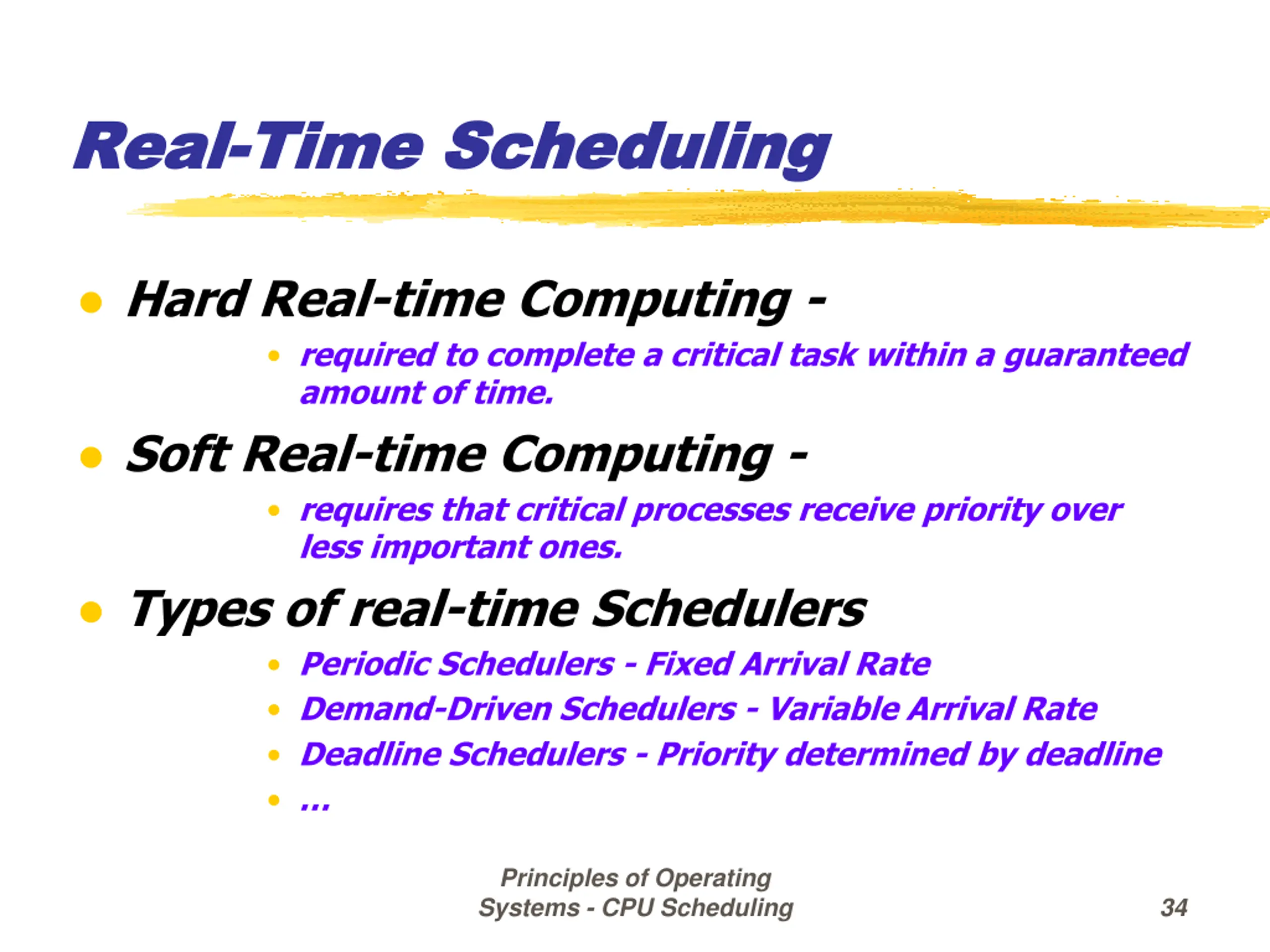 Real Real- -Time Scheduling Time Scheduling Hard Real-time Computing - required to complete a critical task within a guaranteed amount of time. Soft Real-time Computing - requires that critical processes receive priority over less important ones. Types of real-time Schedulers Periodic Schedulers - Fixed Arrival Rate Demand-Driven Schedulers - Variable Arrival Rate Deadline Schedulers - Priority determined by deadline Principles of Operating Systems - CPU Scheduling 34